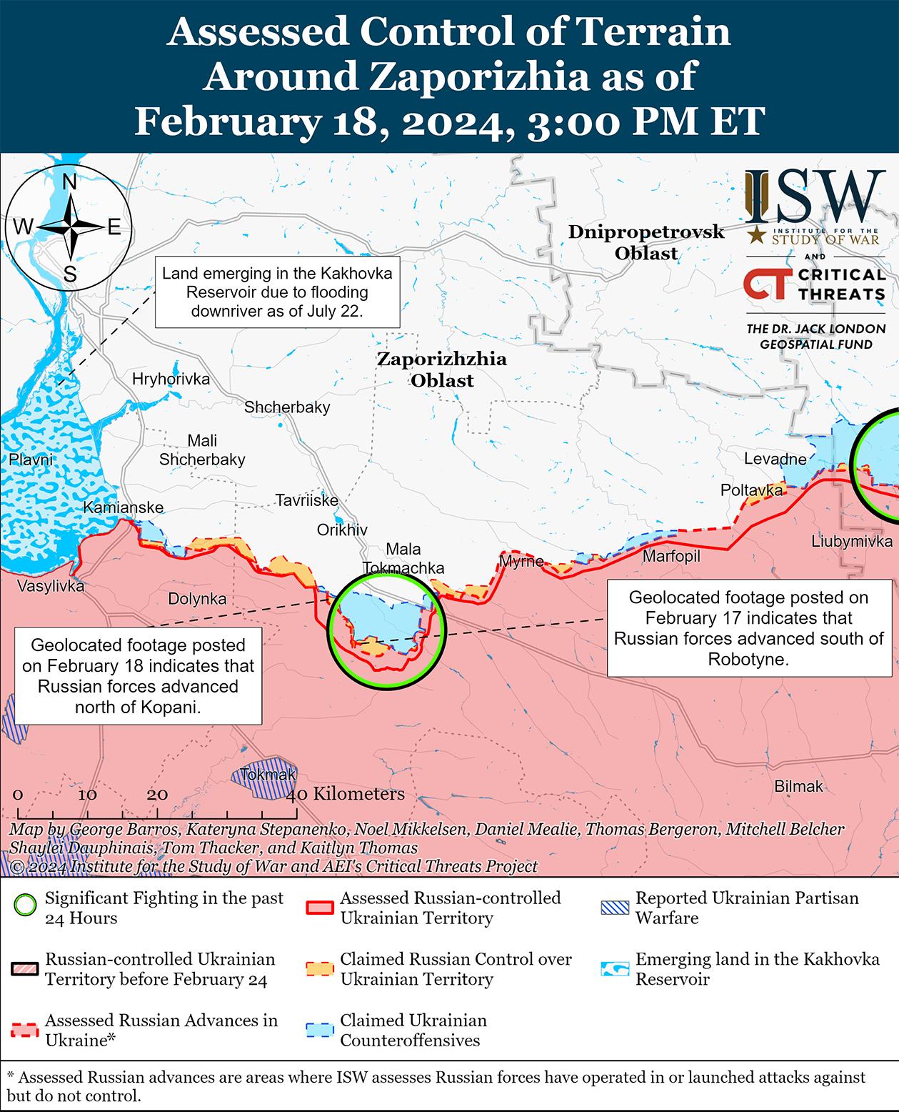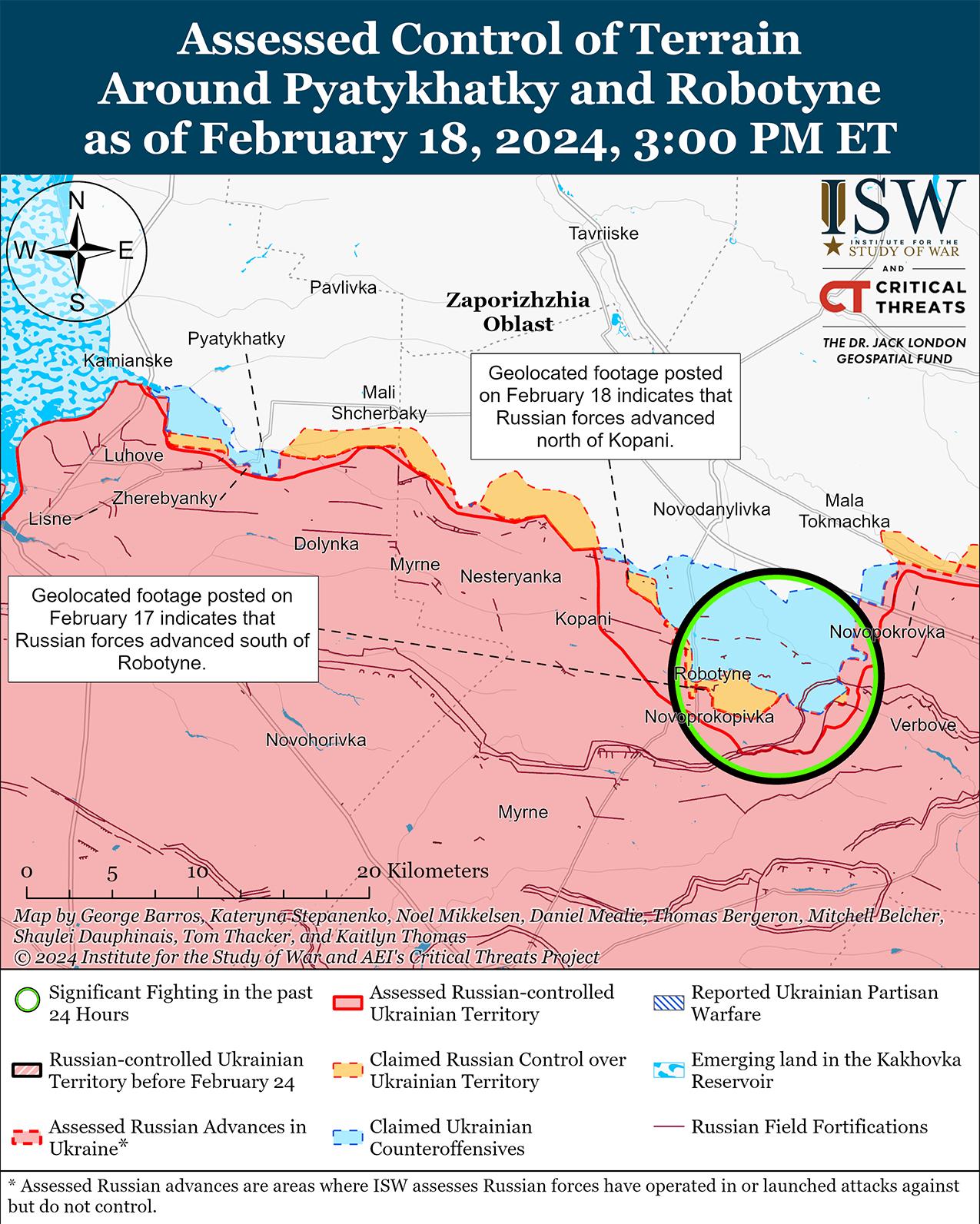Российские войска добились незначительного успеха на западе Запорожской области после сообщений о возобновлении наступательных действий на этом участке фронта. На геолоцированных кадрах, опубликованных 18 февраля, видно, что российские войска недавно продвинулись вдоль бурелома к северу от Копани (6 км к северо-западу от Работино). [50] Российские военные блогеры также утверждали, что российские войска продвинулись до 1,7 км к северо-западу от Вербового (к востоку от Работино) и до двух км в районе самого Работино, хотя ISW не обнаружил визуальных доказательств, подтверждающих такое обширное продвижение российских войск. [51] 18 февраля Восточная группа войск Украины заявила, что 17 февраля украинские силы отразили российскую атаку в составе «достаточно большого количества личного состава» примерно 30 единицами техники в неустановленном районе на Запорожском направлении (вероятно, в районе Работино), что соответствует многочисленным заявлениям РФ о том, что 17 февраля российские войска возобновили наступление в направлении Работино. [52] Российский блогер жаловался, что российские войска использовали модернизированные основные боевые танки советских времен Т-55 со слабой защитой от беспилотников и слабой броней корпуса и башни в крупном наступлении под Работино 17 февраля. [53] Сообщается, что подразделения российской 76-й воздушно-десантной дивизии (ВДВ) и 70-го мотострелкового полка (42-я мотострелковая дивизия, 58-я общевойсковая армия, Южный военный округ) продолжают действовать в районе Работино. [54] Сообщается, что на Запорожском направлении продолжают действовать подразделения 7-й дивизии ВДВ. [55]