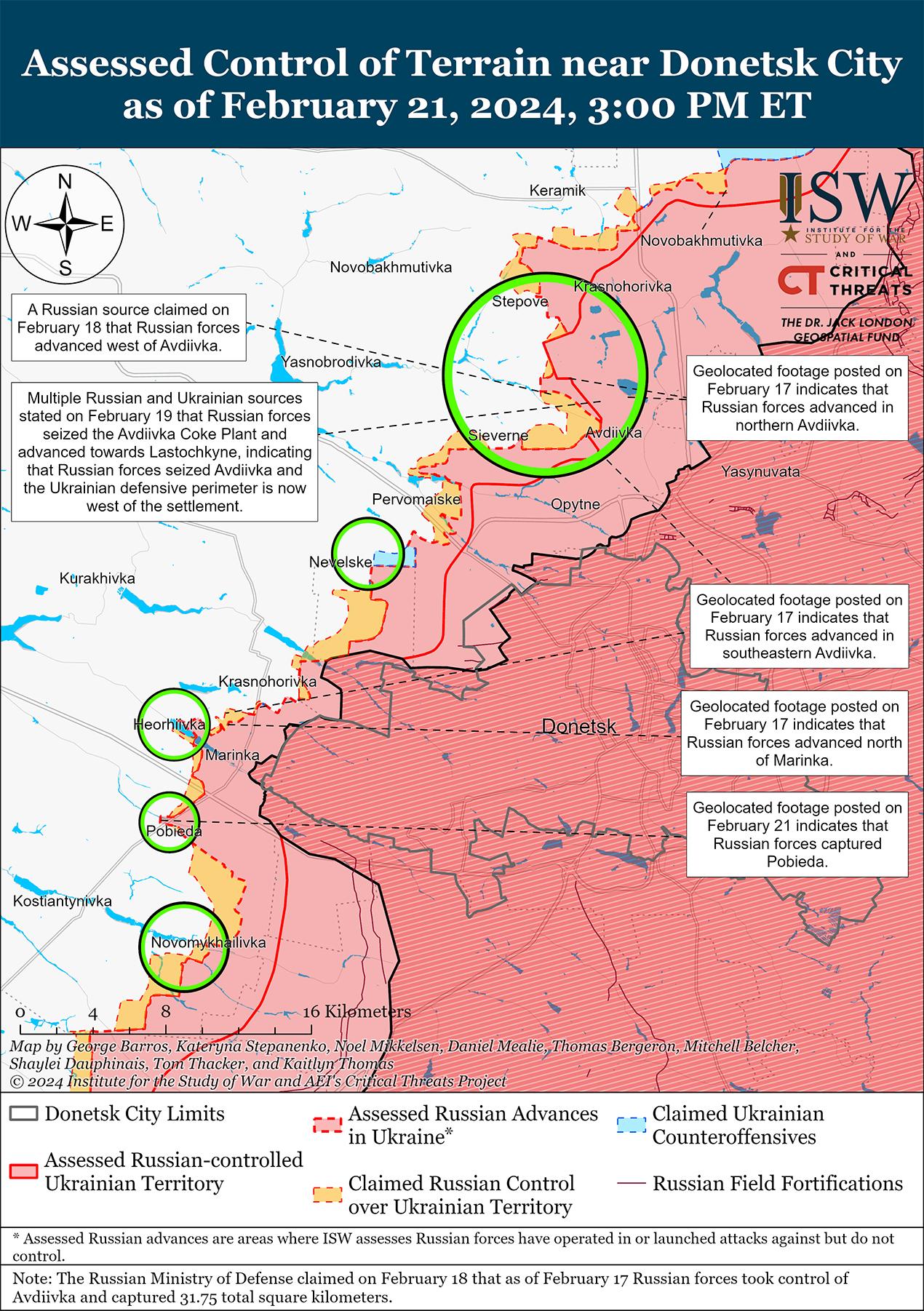 Российские войска недавно незначительно продвинулись к северо-западу от Авдеевки и, вероятно, завершили операции по зачистке Авдеевки. На геолоцированных кадрах, опубликованных 19 февраля, видно, что российские войска немного продвинулись на восточной окраине Ласточкино (северо-западнее Авдеевки). [51] Продолжались позиционные бои северо-западнее Авдеевки в районе Степового и Ласточкино; западнее Авдеевки в районе Северного; и юго-западнее Авдеевки в районе Первомайского и Невельского. [52] Один российский блогер заявил, что российские войска пытаются построить и стабилизировать новую линию обороны на Авдеевском направлении. [53] Российские источники дополнили кадры, на которых, как утверждается, запечатлены бойцы 114-й мотострелковой бригады (1-й армейский корпус ДНР) на Авдеевском коксохимическом заводе. [54]