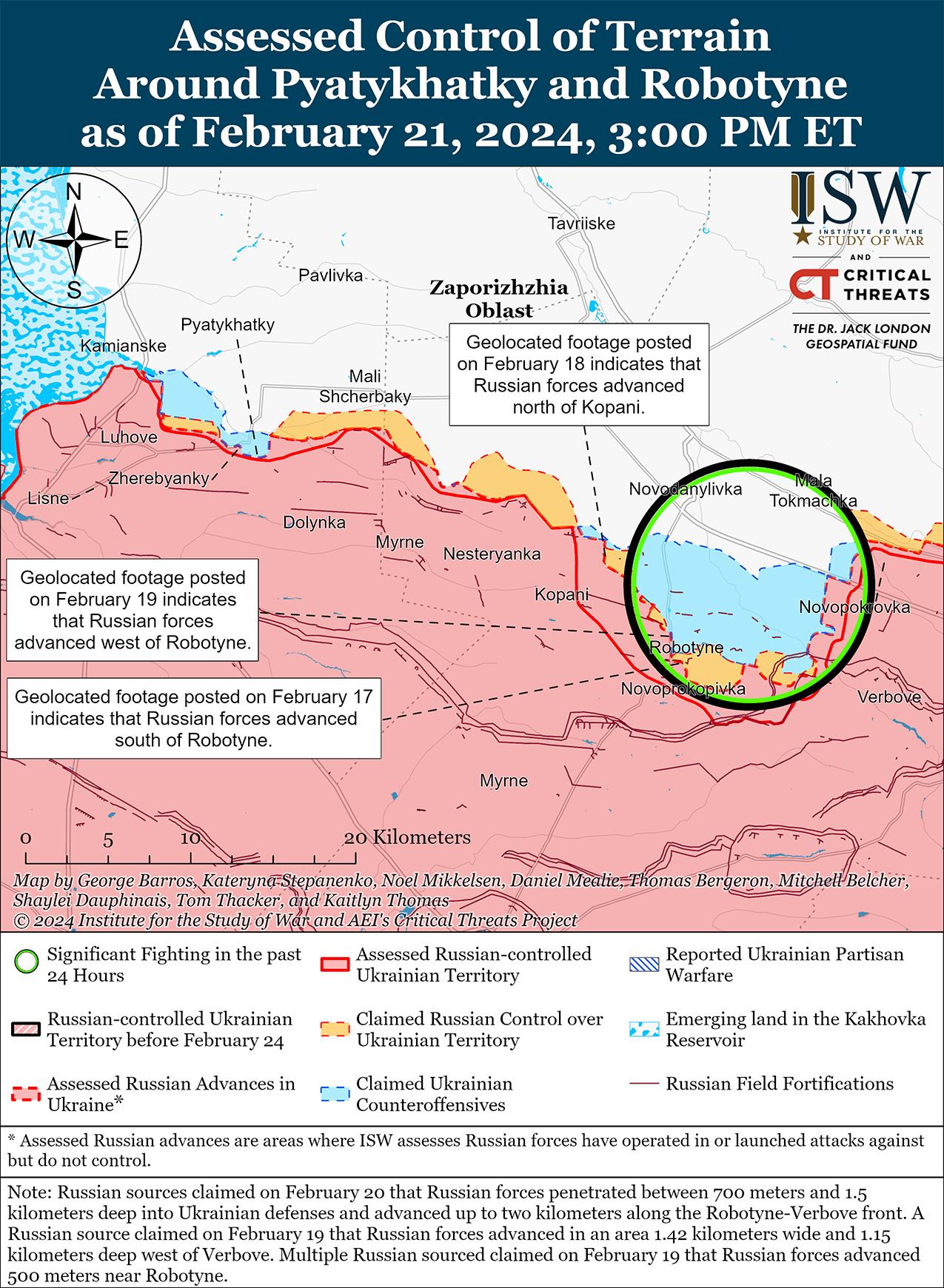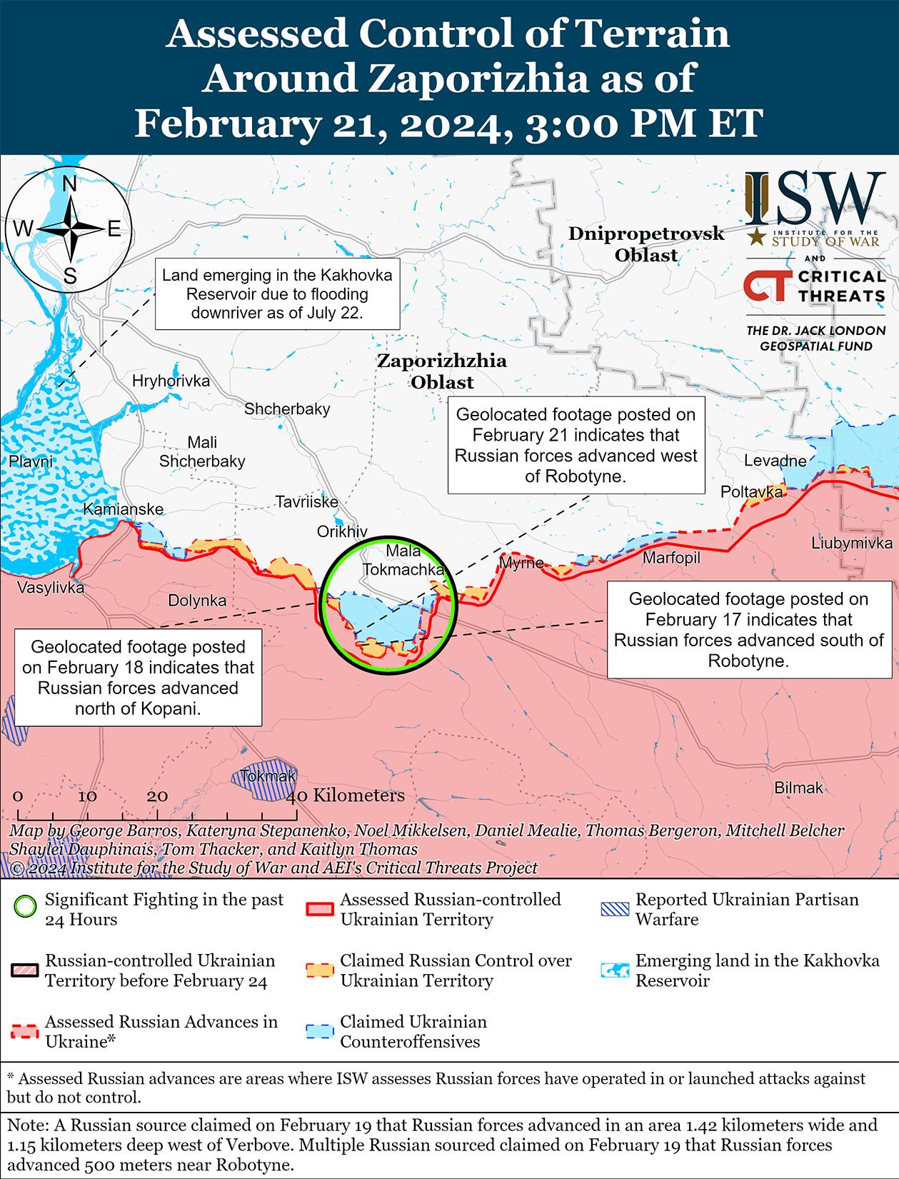 Российские войска недавно подтвердили продвижение на западе Запорожской области. Геолоцированные кадры, опубликованные 21 февраля, свидетельствуют о том, что российские войска продвинулись в западной части Работино. [66] Дополнительные геолоцированные кадры, опубликованные 21 февраля, свидетельствуют о том, что российские войска также продвинулись к западу от Вербовое (к востоку от Работино). [67] Российский военный блогер, ссылаясь на неназванных украинских аналитиков, утверждал, что российские войска продвинулись на 2,02 км в ширину и 650 м в глубину в районе Новопрокоповки (к югу от Работино), однако ISW не обнаружил визуального подтверждения этого заявления. [68] Продолжались позиционные бои в районах населенных пунктов Вербовое, Работино и Малая Токмачка (северо-восточнее Работино и юго-восточнее Орехова). [69] Командующий украинской Таврийской группировкой войск бригадный генерал Александр Тарнавский заявил, что российские войска на Ореховском направлении пытаются передвигаться небольшими группами пехоты и на скоростных вездеходах, но российские атаки на этом направлении безуспешны. [70] Сообщается, что подразделения российского 70-го мотострелкового полка (42-я мотострелковая дивизия, 58-я общевойсковая армия, Южный военный округ) действуют в районе Работино. [71]