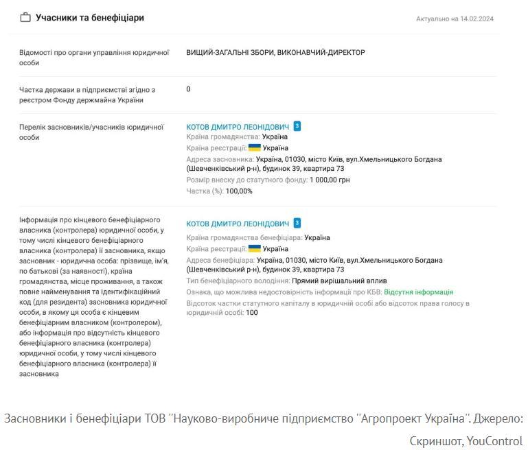 Товариство зі статутним капіталом лише у 1000 грн було зареєстроване в березні 2018 року (за пів року до вступу в дію нового закону “Про оцінку впливу на довкілля”), директором є Юрій Котов, а засновником і бенефіціаром – Дмитро Котов.