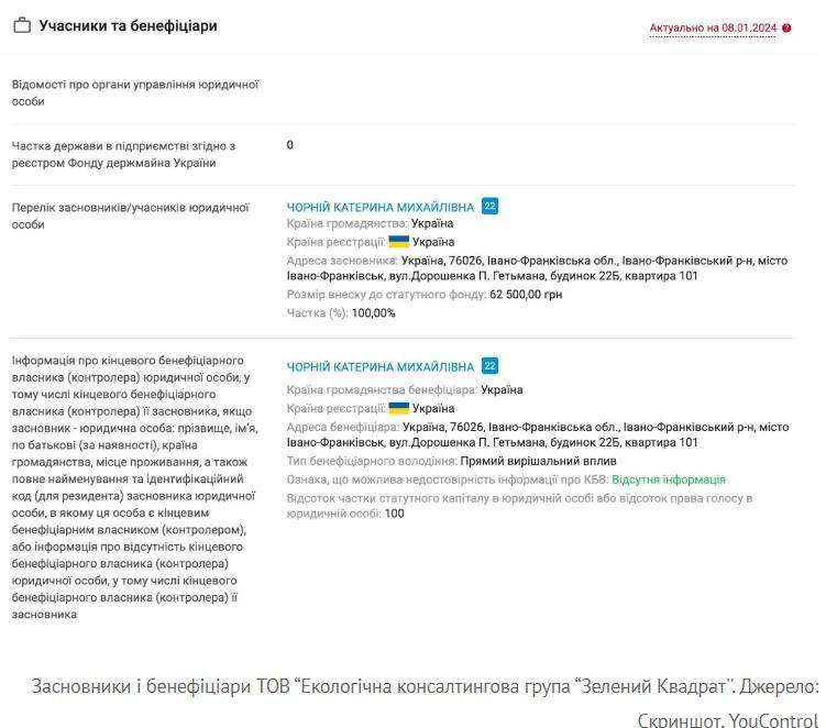 ТОВ “Екологічна консалтингова група “Зелений Квадрат” було зареєстроване у 2009 році і має широкий спектр видів діяльності – 18. Уповноважена особа і засновниця – Катерина Чорній. Вона також керує і ТОВ “Науково-екологічний центр “Зелений Квадрат”, а ще зареєстрована як ФОП на Івано-Франківщині.