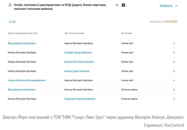 ТОВ “НВК “Смарт Лекс Груп” очолює Вікторія Ковтун. За даними YouControl, вона є суб’єктом декларування, а її чоловік Дмитро Йора у 2015-2020 роках працював на керівній посаді в Мін’юсті, а у 2023 році у відкритих джерелах вказаний як підписант в Міноборони.