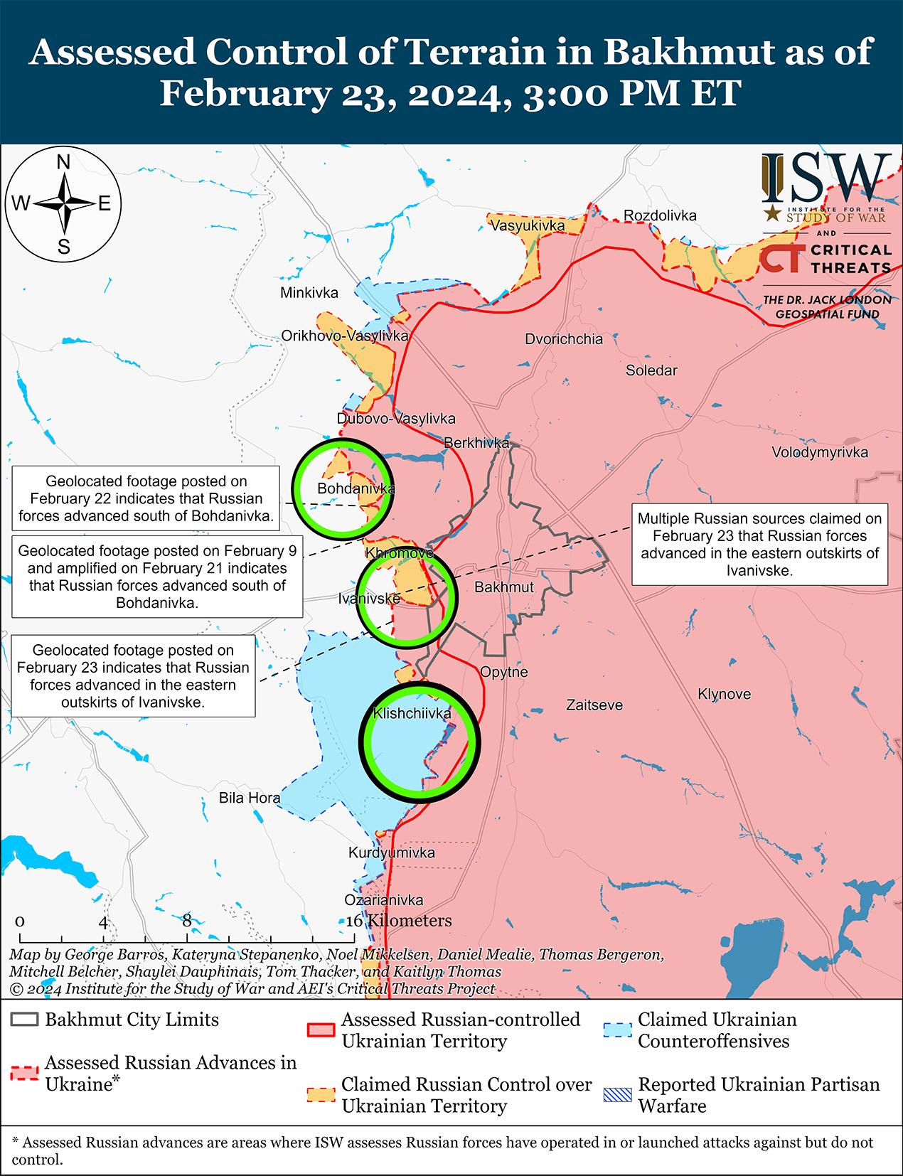 Президент Украины Владимир Зеленский заявил, что украинские силы планируют будущие контрнаступательные операции, хотя задержки с оказанием помощи Западом в области безопасности, вероятно, продолжат создавать неопределенность и ограничения для этих операций. В интервью телеканалу Fox News, опубликованном 22 февраля, Зеленский заявил, что украинские силы будут готовиться к новым контрнаступательным операциям в 2024 году, но их главная цель — продолжать оборонять украинскую территорию. [12] Зеленский признал, что нехватка материальных средств осложняет текущие украинские операции, особенно на востоке Украины. [13] Телеканал ABC News сообщил 22 февраля, что, по оценкам официальных лиц США, украинские силы начнут сталкиваться с критической нехваткой боеприпасов и ракет ПВО в конце марта 2024 года, и что эта нехватка будет становиться все более существенной в течение весны и лета 2024 года. [14] Нехватка материальных средств, вероятно, вынуждает украинские силы экономить материальную часть, а задержки с оказанием помощи Западом в области безопасности, вероятно, продолжат создавать неопределенность в украинских оперативных планах и ограничения на подготовку к будущим контрнаступательным операциям. [15] ISW по-прежнему считает, что для Украины было бы проблематично уступить России инициативу на всем театре военных действий дольше, чем это необходимо, поскольку Украина рискует поглотить ресурсы, которые она надеялась сохранить для контрнаступательных операций в попытках остановить продолжающиеся российские атаки. [16] Однако продолжающиеся задержки с оказанием помощи в области безопасности и сохраняющаяся нехватка материальных средств могут вынудить украинские силы принимать жесткие решения о том, как распределять ресурсы между потенциально важными контрнаступательными операциями и продолжающимися усилиями по удержанию позиции.
