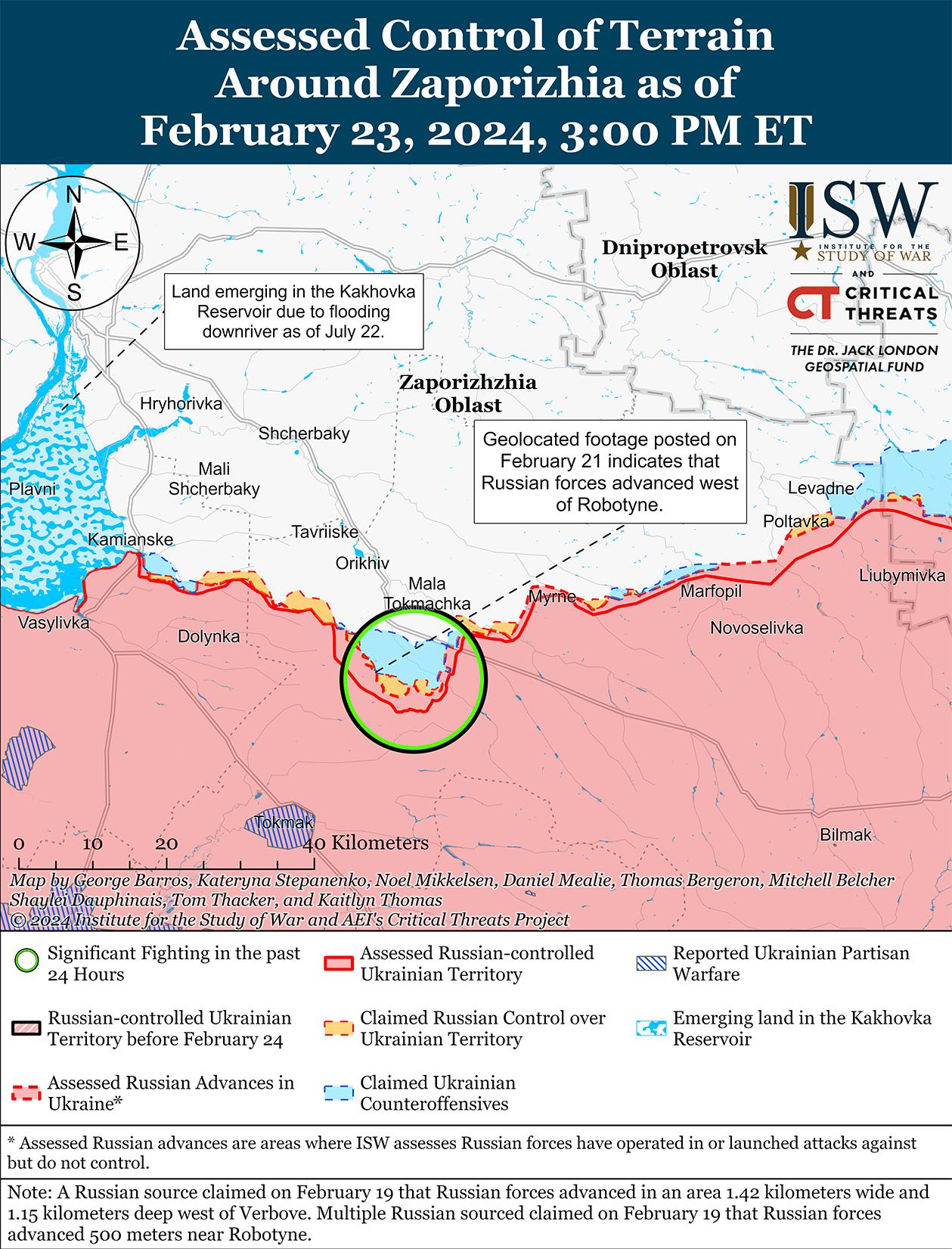23 февраля продолжались позиционные бои на западе Запорожской области в районах населенных пунктов Работино и Вербовое (восточнее Работино). [60] Российские военные блогеры утверждали, что бои в центре Работино продолжались 22 и 23 февраля. [61] Сообщается, что подразделения российского 429-го мотострелкового полка (19-я мотострелковая дивизия, 58-я ОА, Южный военный округ [ЮВО]) действуют в районе Каменского (западнее Работино). [62]
