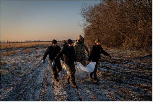 Члены гуманитарной группы, которая собирает останки погибших солдат, несут тело российского военнослужащего возле Коровьего Яра в Донецкой области Украины в прошлом году. Фото…Николь Тунг для «Нью-Йорк Таймс»