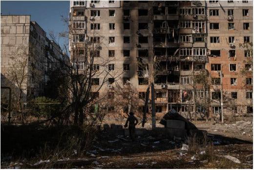 Поврежденные здания в Авдеевке, Украина, в октябре. Российская армия взяла город под свой контроль в этом месяце после нескольких месяцев интенсивных боев и тяжелых потерь. Фото…Николь Тунг для «Нью-Йорк Таймс»