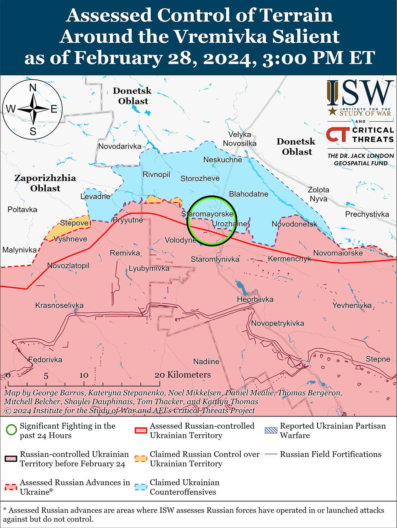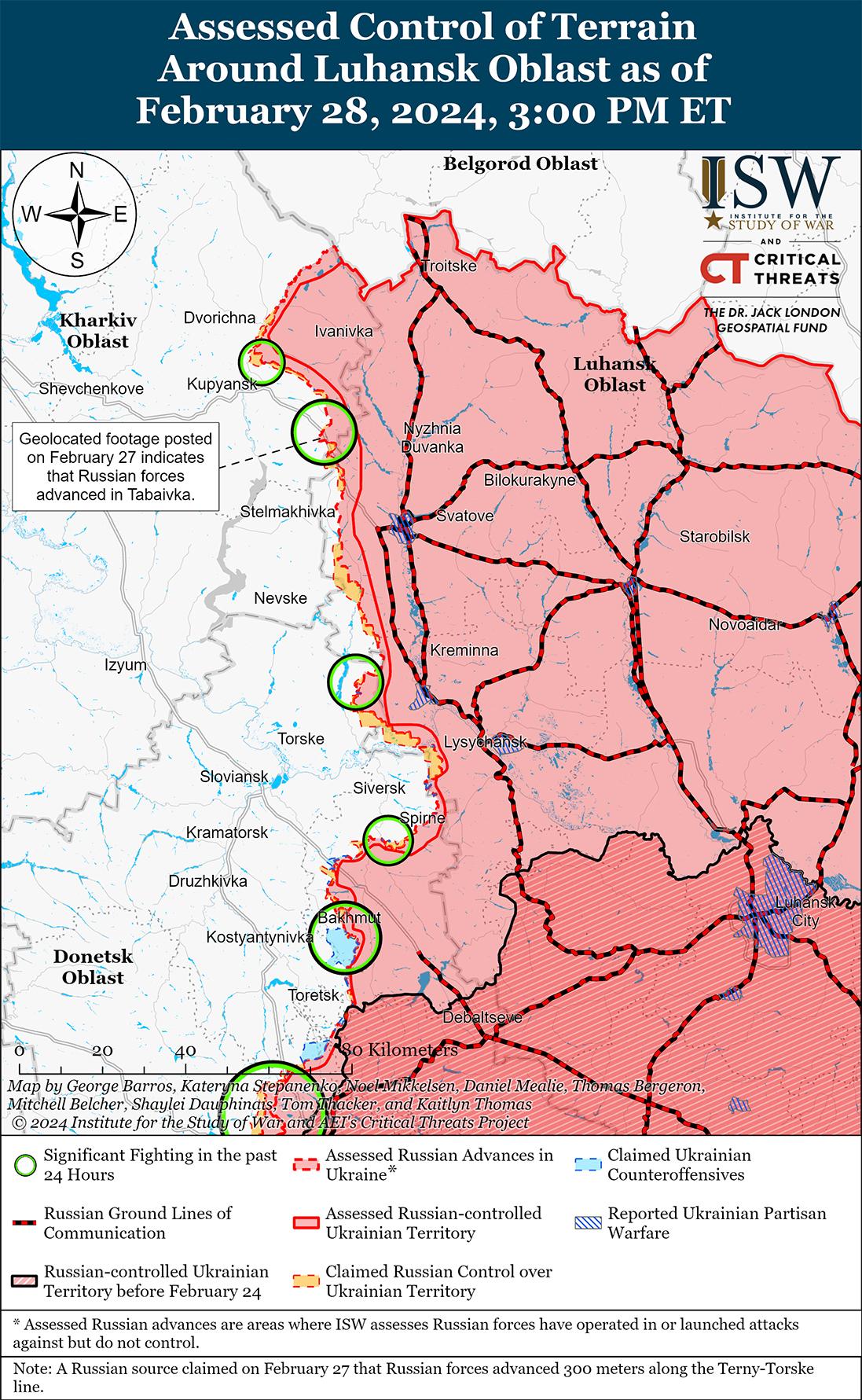 Недавно российские войска продвинулись к северо-западу от Сватово на фоне продолжающихся позиционных боев на линии Купянск-Сватово-Кременная 28 февраля. На геолоцированных кадрах, опубликованных 28 февраля, видно, что российские войска продвинулись в Табаевку (северо-западнее Сватово). [34] Продолжались позиционные бои северо-восточнее Купянска в районе Синьковки; западнее Кременной в районе Терны и Ямполовки; и южнее Кременной в районе Белогоровки и Серебрянского лесничества. [35] Украинский военный обозреватель Константин Машовец сообщил, что подразделения российской 25-й мотострелковой бригады и 138-й мотострелковой бригады (обе входят в состав 6-й общевойсковой армии, Западного военного округа) ведут наступление северо-восточнее Купянска на участке Синьковка-Петропавловка, чтобы обойти Синьковку с запада в сторону Купянска. [36] Машовец заявил, что подразделения российского 15-го мотострелкового полка, усиленные подразделениями 1-го танкового полка (оба из 2-й мотострелковой дивизии, 1-й гвардейской танковой армии, ЗВО), наступают вдоль линии Купянск — Сватово. [37] Машовец также сообщил, что российские войска перебросили в район Терны штурмовые роты «Шторм» 254-го мотострелкового полка (144-я мотострелковая дивизия, 20-я ОА, ЗВО). [38]