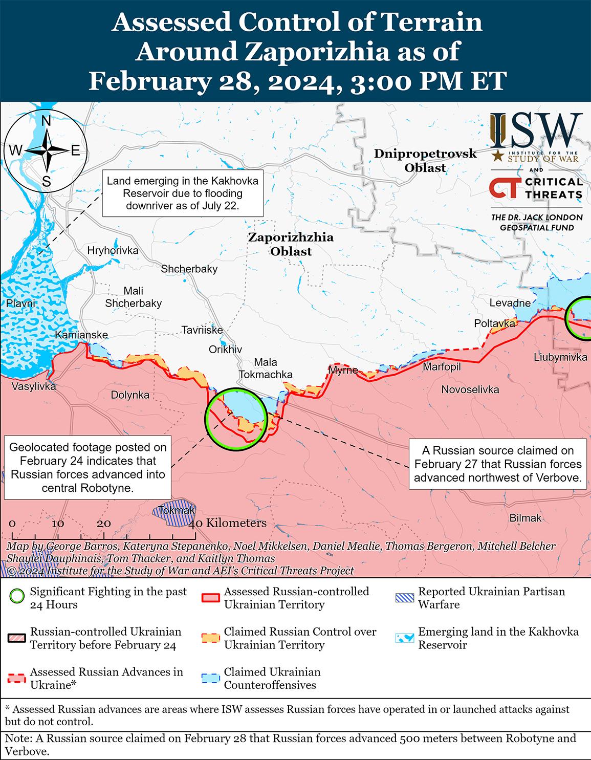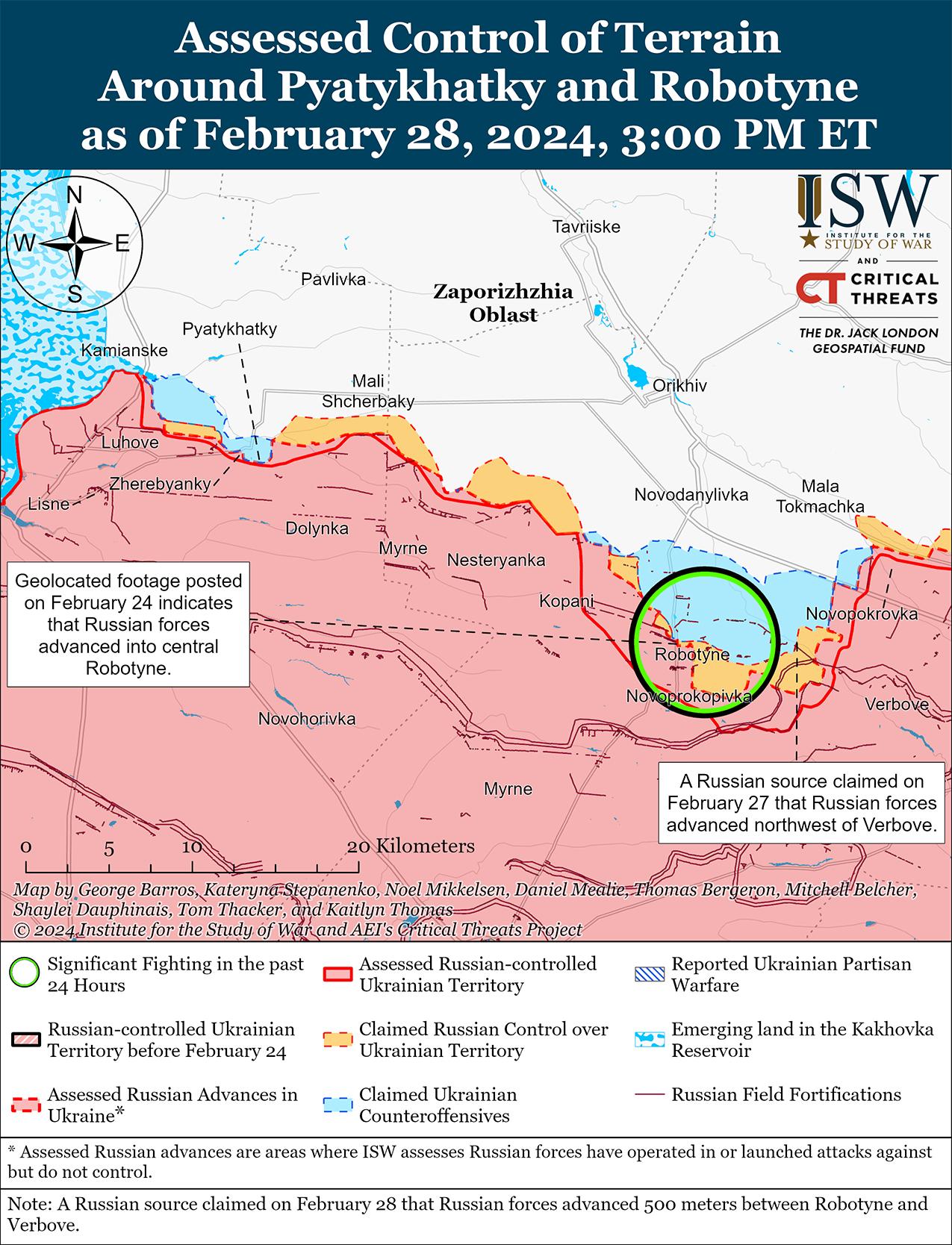 28 февраля враг продолжил локальные наступательные действия на западе Запорожской области, но подтвержденных успехов на этом участке не добился. Несколько российских источников заявили, что российские войска продолжают боевые действия на южных окраинах Работино, и сообщили, что украинские силы удерживают позиции на севере Работино. [61] Один из блогеров утверждал, что российские войска продвинулись в этом направлении на расстояние до 500 метров и отбили позиции между Работино и Вербовое (к востоку от Работино), хотя ISW не обнаружил визуальных доказательств этих предполагаемых российских успехов между Работино и Вербовым. [62] Другой блогер утверждал, что российские войска возобновили атаки к северо-западу от Вербового, но украинские войска по-прежнему удерживают здесь свои позиции. [63] Сообщается, что подразделения российских 70-го и 71-го мотострелковых полков (оба входят в состав 42-й мотострелковой дивизии, 58-й ОА Южного военного округа [ЮВО]) и 7-й гвардейской горно-штурмовой дивизии (ВДВ) продолжают действовать между Работино и Вербовым. [64]