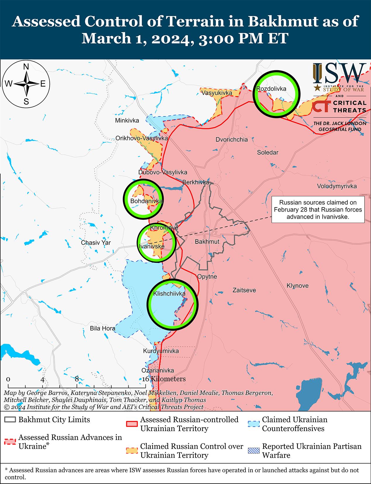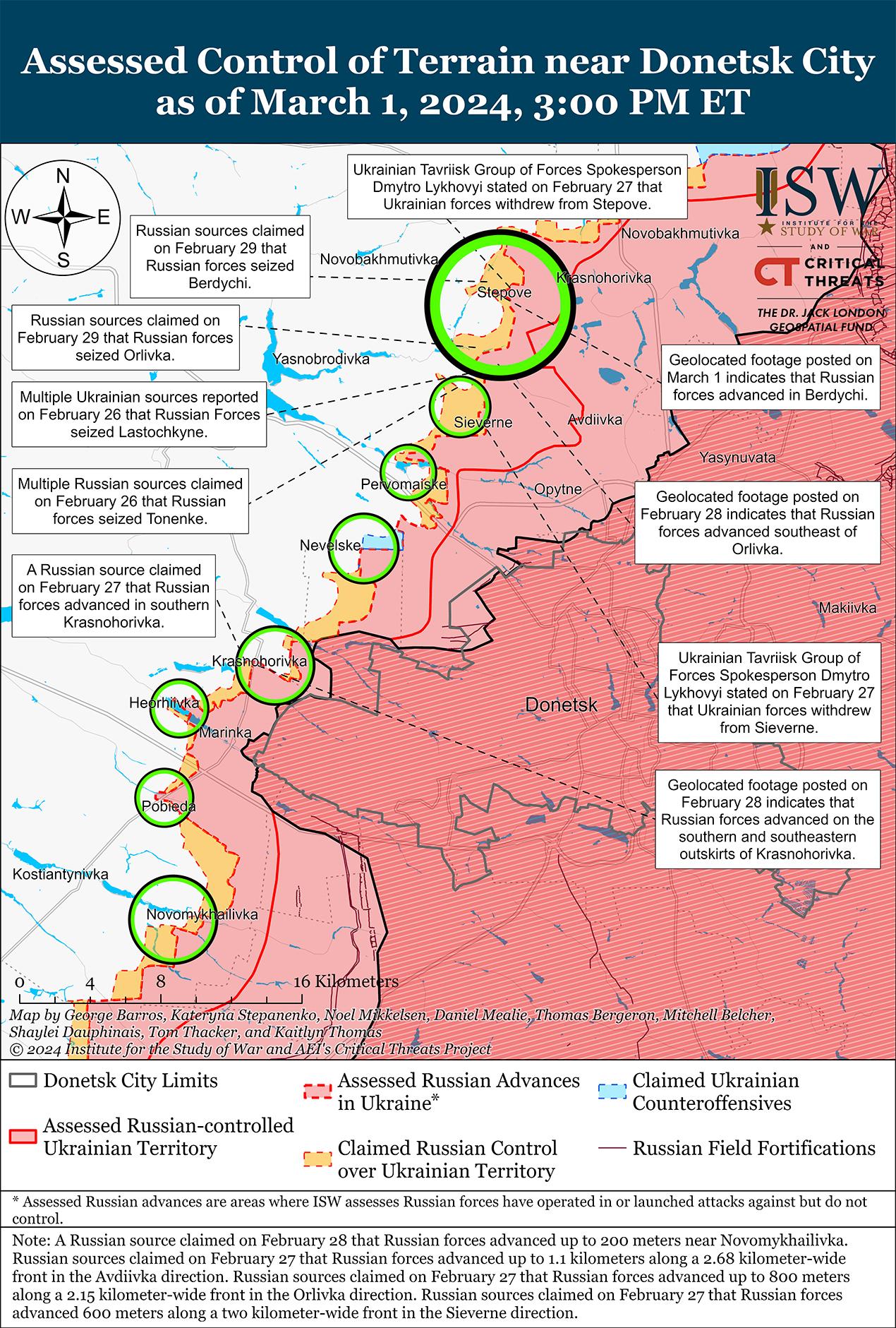Пресс-секретарь украинской Хортицкой группировки войск капитан Илья Евлаш сообщил 1 марта, что украинские силы заняли значительные оборонительные позиции вблизи Часового Яра (к западу от Бахмута). Евлаш заявил, что украинские силы начали готовить Часов Яр к обороне сразу после захвата Россией Бахмута в мае 2023 года и что вокруг населенного пункта есть несколько украинских оборонительных «колец». [37] По словам Евлаша, вблизи Часового Яра украинские силовики создали десятки оборонительных позиций размером с отделение и десятки оборонительных позиций размером со взвод, а также укрепления и огневые точки в самом Часовом Яру. [38] Евлаш также заявил, что украинские силы создали минные поля и другие оборонительные заграждения в районе Часового Яра. [39] Имеющиеся снимки, которые ISW в настоящее время не представляет и не описывает более подробно для обеспечения оперативной безопасности Украины, показывают, что украинские силы создали значительные укрепления в форме кольца в районе Часового Яра. Евлаш заявил, что потенциальный захват Россией Часового Яра откроет российским войскам пути продвижения в направлении Константиновки (юго-западнее Часового Яра) и что главной оперативной целью российских войск в Донецкой области остается Краматорско-Славянская агломерация (около 35 км к северо-западу от Бахмута). [40]
