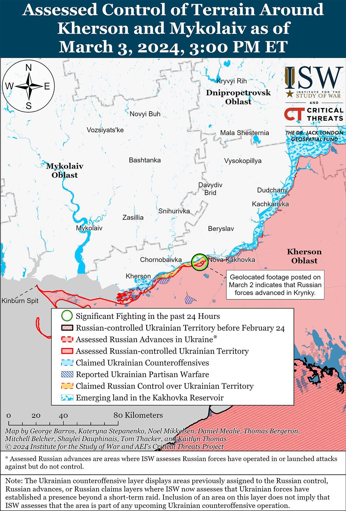 3 марта продолжались позиционные бои в районах населенных пунктов Крынки и Антоновский автодорожный мост на восточном (левом) берегу Херсонской области. [57] Известный российский военный блогер утверждал, что российские командиры низшего звена продолжают ложно докладывать российскому военному командованию об успешных и точных российских ударах по украинским позициям из реактивных систем залпового огня (РСЗО). [58] Одно из российских оппозиционных СМИ опубликовало видео, на котором российские военнослужащие жалуются на то, что им двое суток приходится ждать эвакуации из окопа в Крынки. [59]