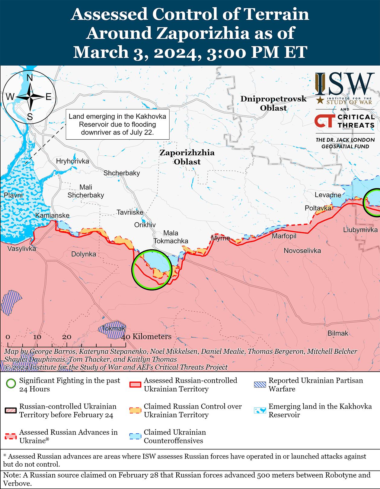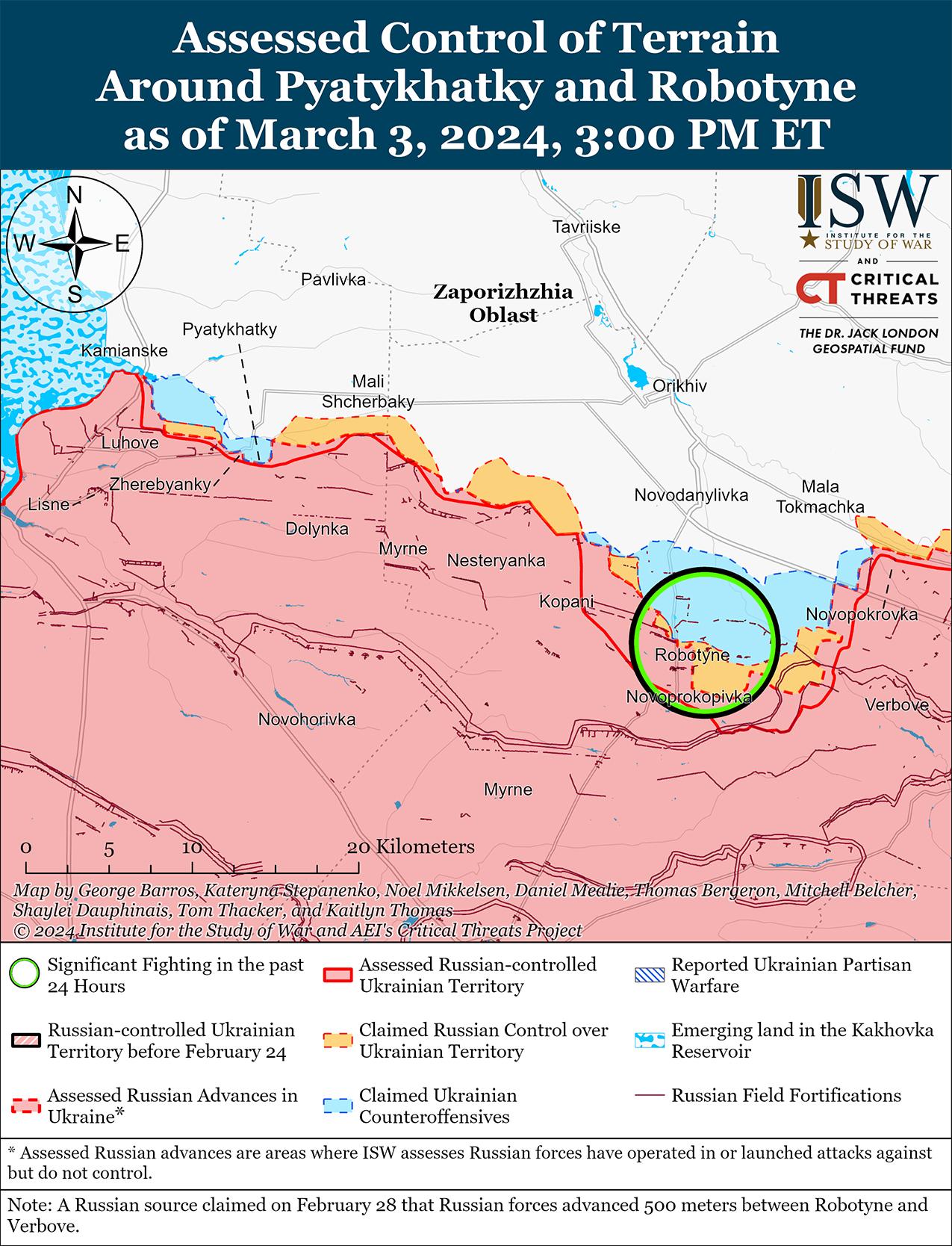 Позиционные бои продолжались в районе населенного пункта Работино на западе Запорожской области, но по состоянию на 3 марта на линии фронта изменений не произошло. Позиционные бои происходили в районе Работино и западнее Новопрокоповки (южнее Работино). [52] Известный российский военный блогер утверждал, что украинские войска проводят маневренную оборону в Работино, а другой военный блогер утверждал, что украинские войска дистанционно минируют этот район, чтобы замедлить продвижение российских войск. [53] Блогер отметил, что российские войска продвигаются медленнее в районе Вербовое (к востоку от Работино), чем в районе Работино, и что в последние месяцы российские войска активизировали артиллерийский огонь в этом районе. [54] Военный блогер добавил, что подразделения российской 7-й гвардейской воздушно-десантной дивизии (ВДВ) продвинулись в районе Вербового, но ISW не обнаружил подтверждения этому заявлению. [55] Сообщается, что в районе Вербовое-Работино действуют подразделения 4-го гвардейского зенитного ракетного полка (76-я гвардейская дивизия ВДВ), в районе Работино – части российской 42-й мотострелковой дивизии (58-я общевойсковая армия, Южный военный округ), а операторы беспилотников отряда «Русские ястребы» 503-го мотострелкового полка 19-й мотострелковой дивизии, 58-я ОА, ЮВО) действуют на Запорожском направлении. [56]
