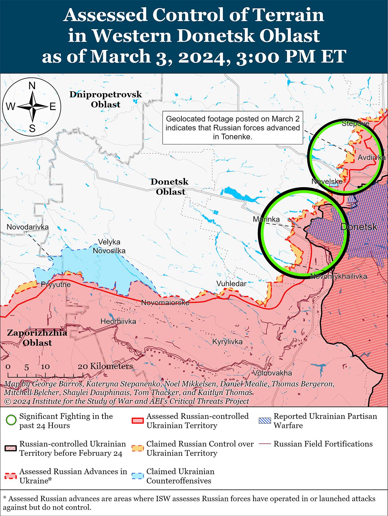 3 марта продолжались позиционные бои в районе Авдеевки, но подтвержденных изменений на линии фронта не было. Продолжались позиционные бои северо-западнее Авдеевки в районах населенных пунктов Бердичи, Степное и Орловка; к западу от Авдеевки у Тоненькое; и юго-западнее Авдеевки в районе Первомайского и Невельского. [40] Официальный представитель украинской Таврийской группировки войск Дмитрий Лиховой заявил, что оперативная обстановка в Бердичах, Орловке и Тоненьком стабилизируется и украинские силы отбивают российские атаки в этих населенных пунктах. [41] Лиховой добавил, что российские войска не захватили Бердичи, Орловку или Тоненькое, но имеют отдельные локальные успехи на Авдеевском направлении. Российский блогер заявил, что украинские силы успешно защищаются от российских атак к западу от Авдеевки, используя российские военные недостатки. Блогер заявил, что некоторым российским мотострелковым подразделениям не хватает гранатометов, необходимых для поражения украинской бронетехники, и что российское командование продолжает использовать неточные карты, которые переоценивают российский контроль над местностью. [42] Сообщается, что подразделения российской 30-й мотострелковой бригады (2-я общевойсковая армия [ОА], Центральный военный округ [ЦВО]) действуют в районе Бердичей; сообщается, что подразделения 110-й мотострелковой бригады (1-й армейский корпус Донецкой Народной Республики [ДНР]) действуют вблизи Невельского; сообщается, что подразделения 14-й артиллерийской бригады «Кальмиус» (1-й АК ДНР) действуют в районе Авдеевки. [43]
