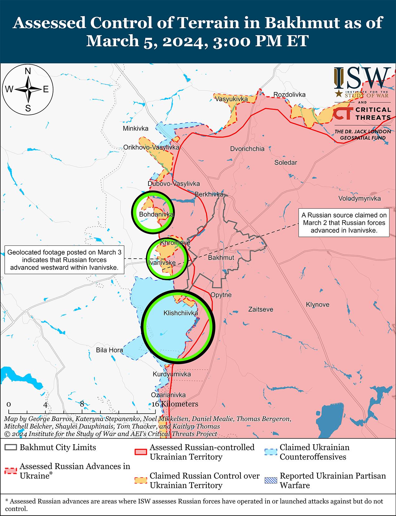 5 марта продолжались позиционные бои к северо-западу, западу и юго-западу от Бахмута. Позиционные бои происходили северо-западнее Бахмута в районе Богдановки; западнее Бахмута в районе Ивановского; и юго-западнее Бахмута вблизи Андреевки, Клещеевки, Белой Горы, Северного и Шумов. [29] Российские военные блогеры утверждали, что российские войска продолжали зачищать позиции в восточном Ивановском и пытались выбить украинские войска с позиций в населенном пункте. [30] Российская 98-я гвардейская воздушно-десантная дивизия (ВДВ) заявила, что ВКС РФ наносят удары по украинским позициям на окраине Часового Яра (западнее Бахмута) планирующими бомбами ФАБ-500 и неуправляемыми ракетами С-8 и С-13. [31] Сообщается, что на Бахмутском направлении действуют подразделения российской 11-й отдельной гвардейской бригады ВДВ и спецназовцы 3-го армейского корпуса. [32]