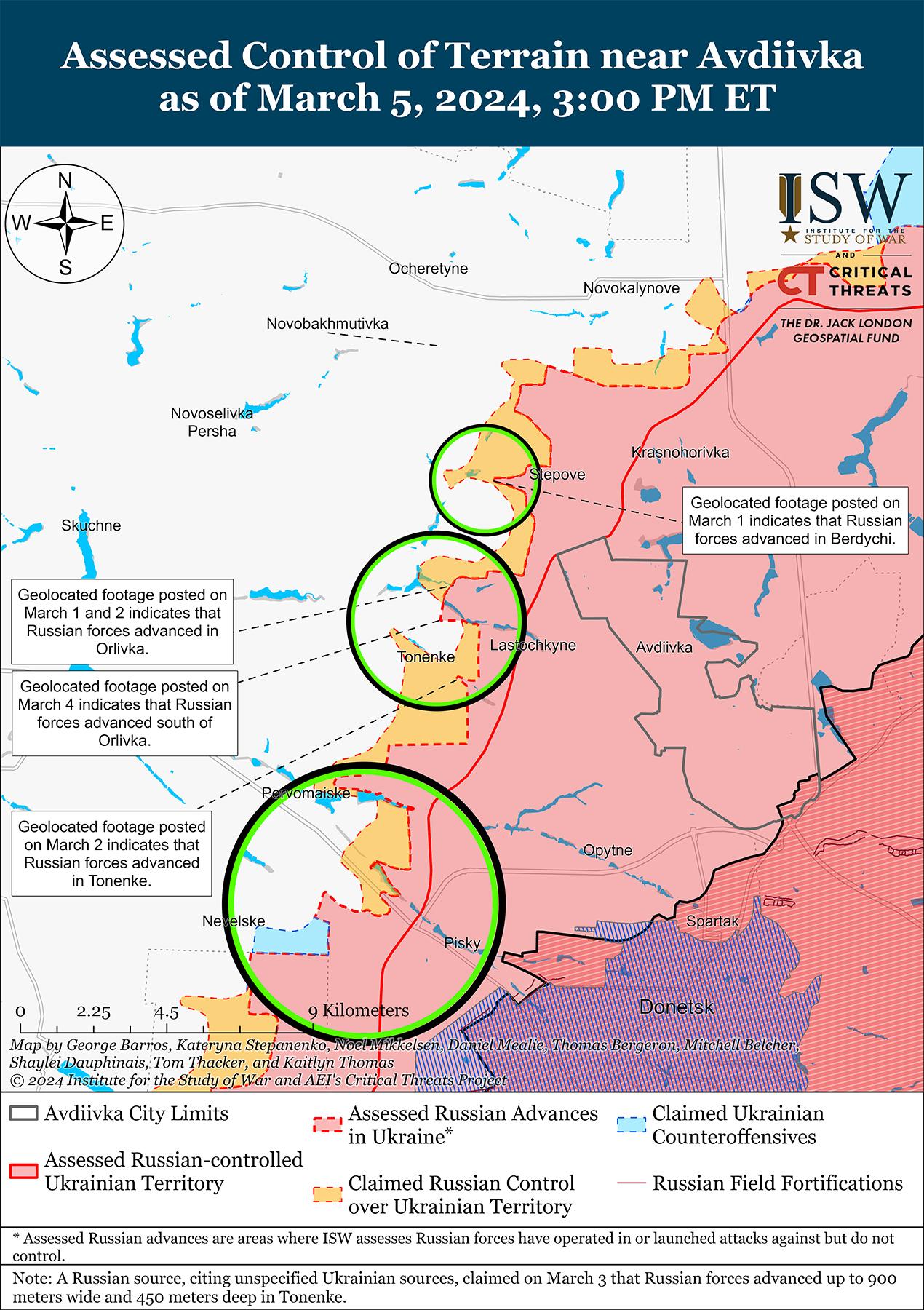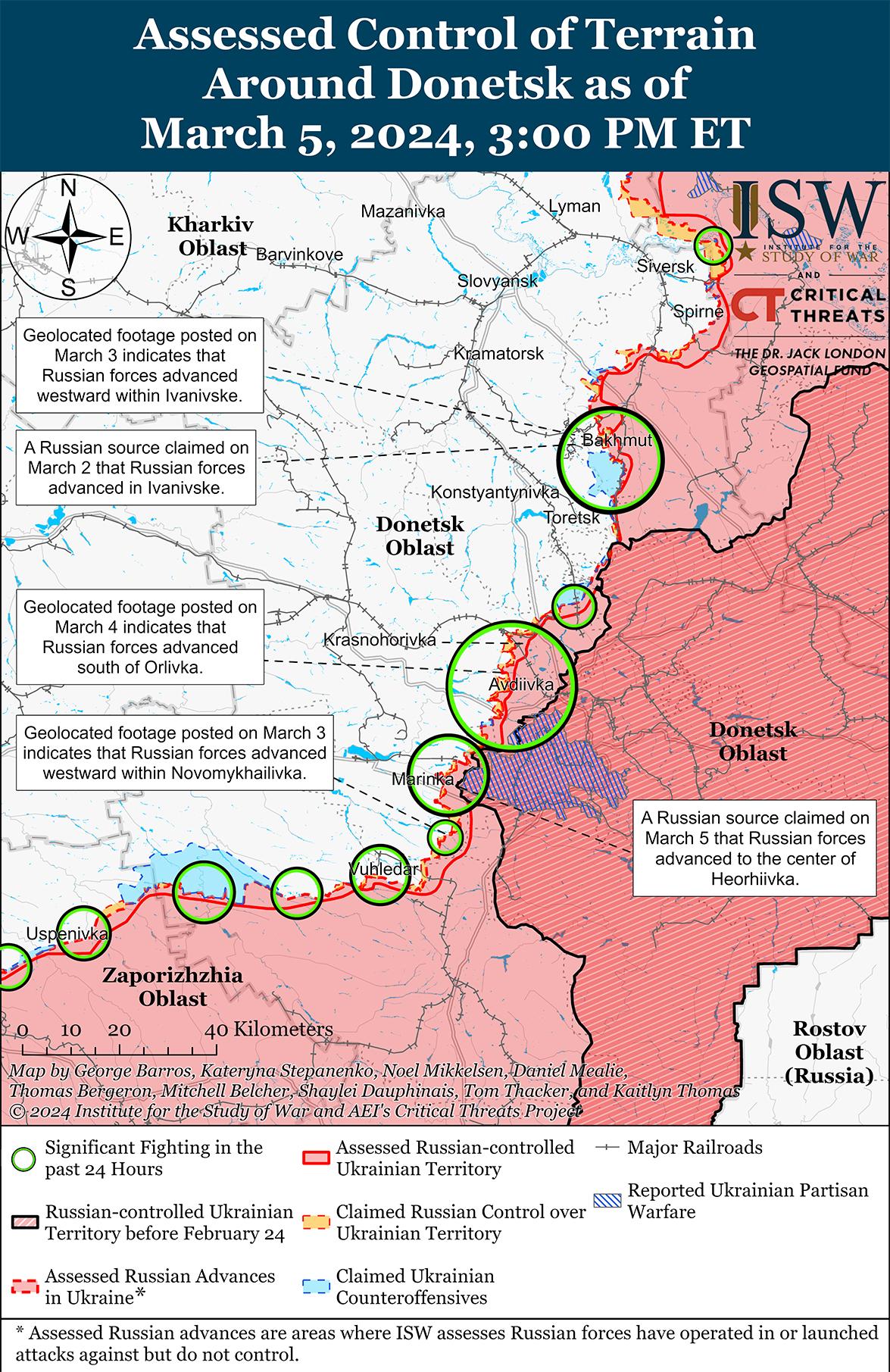 Российские войска продолжали атаковать украинские позиции вокруг Авдеевки, но 5 марта не добились никаких подтвержденных успехов. Украинские и российские источники сообщали о продолжении боев к северо-востоку от Авдеевки в районе Новоселовки; северо-западнее Авдеевки в районе Семеновки; западнее Авдеевки вблизи Бердичей, Орловки и Тоненького; и юго-западнее Авдеевки в районе Первомайского и Невельского. [33] Российские военные утверждали, что российские войска захватили большую часть Орловки, половину Тоненького и половину Первомайского, хотя ISW не обнаружил визуальных доказательств, подтверждающих эти заявления. [34] Российский военный блогер предположил, что российские войска пытаются быстро захватить Орловку, Тоненькое и Бердичи, в то время как украинские силы пытаются задержать продвижение россиян и укрепить оборонительные позиции между Очеретино (северо-западнее Авдеевки) и Тоненьким. [35] Блогер добавил, что российские войска в сутки наносят более 100 авиаударов по украинским позициям в районе Авдеевки. Пресс-секретарь украинской Таврийской группировки войск Дмитрий Лиховой заявил, что украинские полевые укрепления на Донецком направлении (вероятно, речь идет об районе Авдеевки) не состоят из единой сплошной полосы или одной линии траншей, и что украинские силы в настоящее время строят фортификационные сооружения, используя естественный рельеф местности в этом районе, особенно с учетом водных объектов. [36] По словам Лихового, украинские военные подготовили противотанковые рвы, блиндажи и укрытия. Сообщается, что в районе Бердичей действуют подразделения 24-й гвардейской бригады спецназа (ГРУ) и 30-й мотострелковой бригады (2-я гвардейская общевойсковая армия [ОА], Центральный военный округ [ЦВО]); сообщается, что на Авдеевском направлении действуют подразделения российской 21-й гвардейской мотострелковой бригады (2-я ОА, ЦВО). [37]