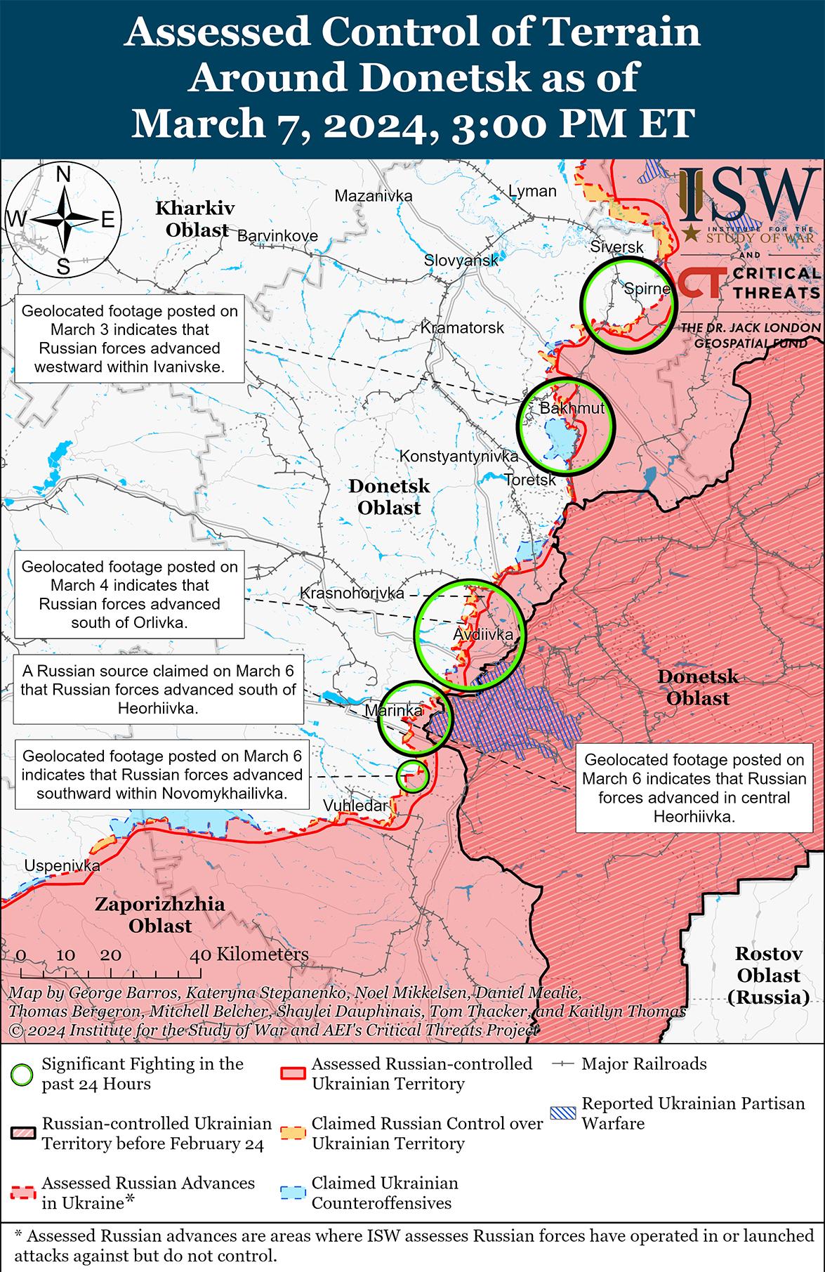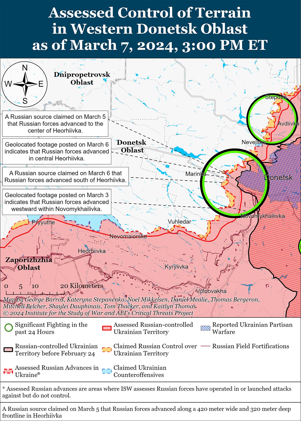 В районе Авдеевки 7 марта продолжались позиционные бои. Российские военные блогеры утверждали, что украинские силы успешно контратаковали в районе Бердичей (северо-запад Авдеевки) и вытеснили российские войска с неустановленных позиций, хотя ISW не обнаружил визуального подтверждения этого заявления. [32] Продолжались позиционные бои северо-западнее Авдеевки в районе Степового и Бердичей; западнее Авдеевки в районе Тоненького и Орловки; и юго-западнее Авдеевки в районе Первомайского и Невельского. [33] Спикер Таврийской группировки войск Украины Дмитрий Лиховой заявил, что российские войска уделяют особое внимание наступательным действиям в направлении Тоненького. [34] Сообщается, что в районе Степового и Бердичей действуют подразделения 25-й и 30-й мотострелковых бригад (обе – 2-я общевойсковая армия, Центральный военный округ), в районе Тоненького, по имеющимся данным, действуют подразделения 114-й мотострелковой бригады (1-й армейский корпус Донецкой Народной Республики) и 55-й мотострелковой бригады (41-я ОА, ЦВО). Сообщается, что подразделения 1-й мотострелковой бригады (1-й АК ДНР) и 35-й мотострелковой бригады (41-я ОА, ЦВО) действуют между Тоненьким и Водяным (юго-запад Авдеевки). [35]