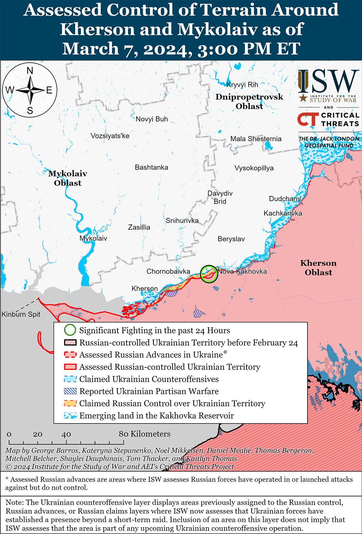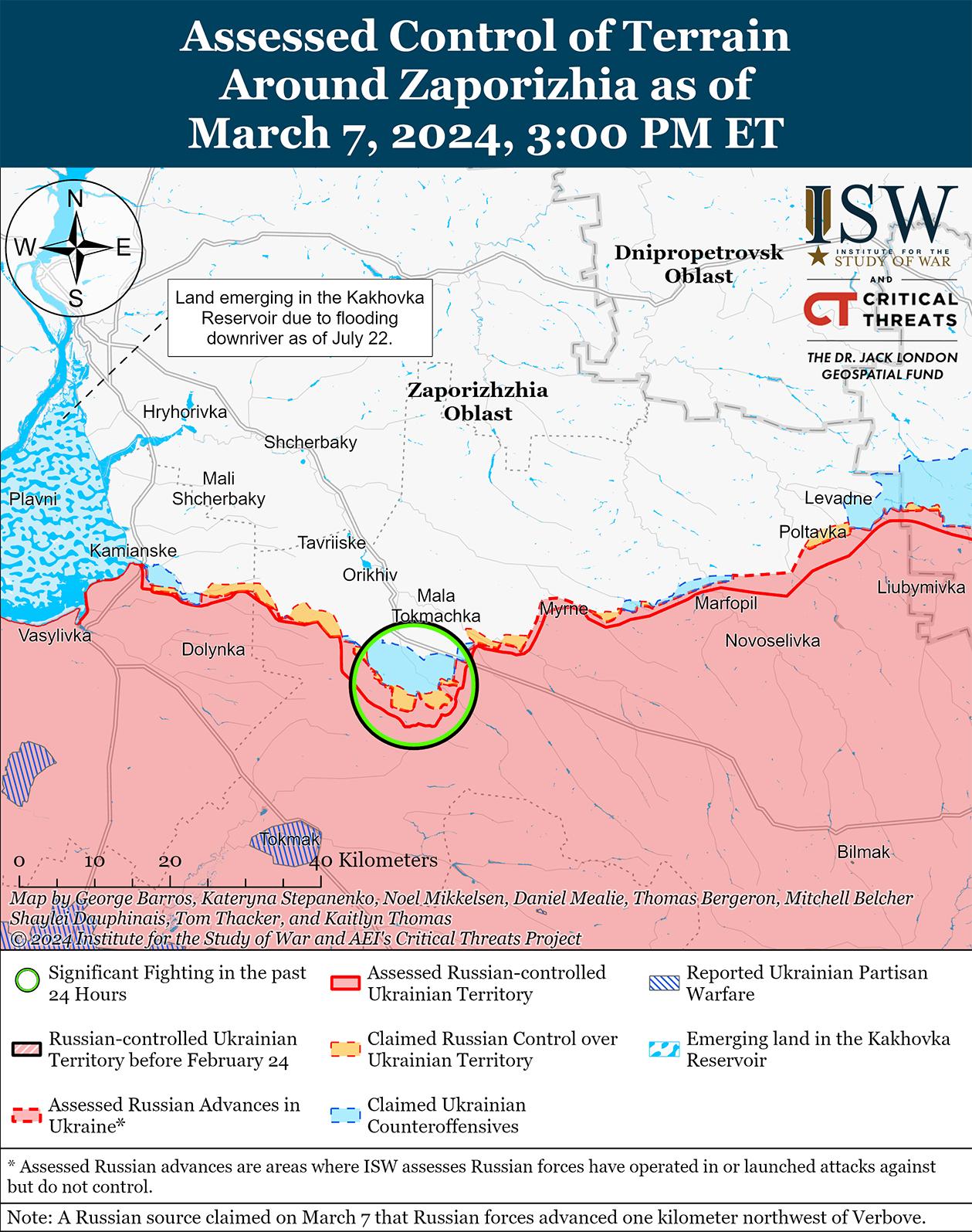 7 марта на западе Запорожской области продолжались позиционные бои, однако подтвержденных изменений линии фронта на этом участке не было. Украинские и российские источники сообщили, что позиционные бои продолжались в районе населенных пунктов Работино и Вербовое (к востоку от Работино). [43] Российские источники утверждали, что российские войска продвинулись на расстояние до одного километра в районе Вербового, однако ISW не обнаружил визуального подтверждения этого заявления. [44] Российский блогер заявил, что украинские системы радиоэлектронной борьбы (РЭБ) осложняют применение российскими войсками беспилотников на Запорожском направлении. [45] Официальный представитель украинской Таврийской группировки войск Дмитрий Лиховой заявил, что российские войска увеличили использование вездеходов (ATV) для перевозки пехоты, особенно по минным полям, на Запорожском направлении. [46] Сообщается, что на Запорожском направлении действуют подразделения российского 503-го мотострелкового полка (19-я мотострелковая дивизия, 58-я общевойсковая армия, Южный военный округ) и части 291-го мотострелкового полка (42-я мотострелковая дивизия, 58-я ОА, ЮВО); сообщается, что подразделения 70-го мотострелкового полка (42-я мотострелковая дивизия, 58-я ОА, ЮВО) действуют в районе Работино; сообщается, что подразделения 247-го воздушно-десантного полка (7-й дивизии ВДВ) действуют в районе Вербовое. [47]