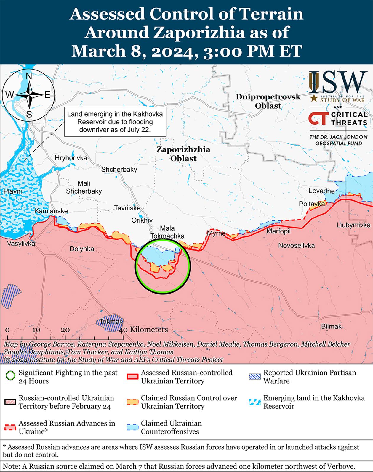 8 марта на западе Запорожской области продолжались позиционные бои. Российские источники утверждали, что российские войска захватили несколько неназванных позиций к северо-западу от Вербовое (к востоку от Работино) и продвинулись на один километр вглубь от Вербовое в сторону Работино, хотя ISW не обнаружил визуальных доказательств этих заявлений. [55] Позиционные бои продолжались в районе Работино и западнее Вербовое. [56] По имеющимся сведениям, в районе Работино действуют подразделения российской 42-й мотострелковой дивизии (58-я общевойсковая армия, Южный военный округ). [57]