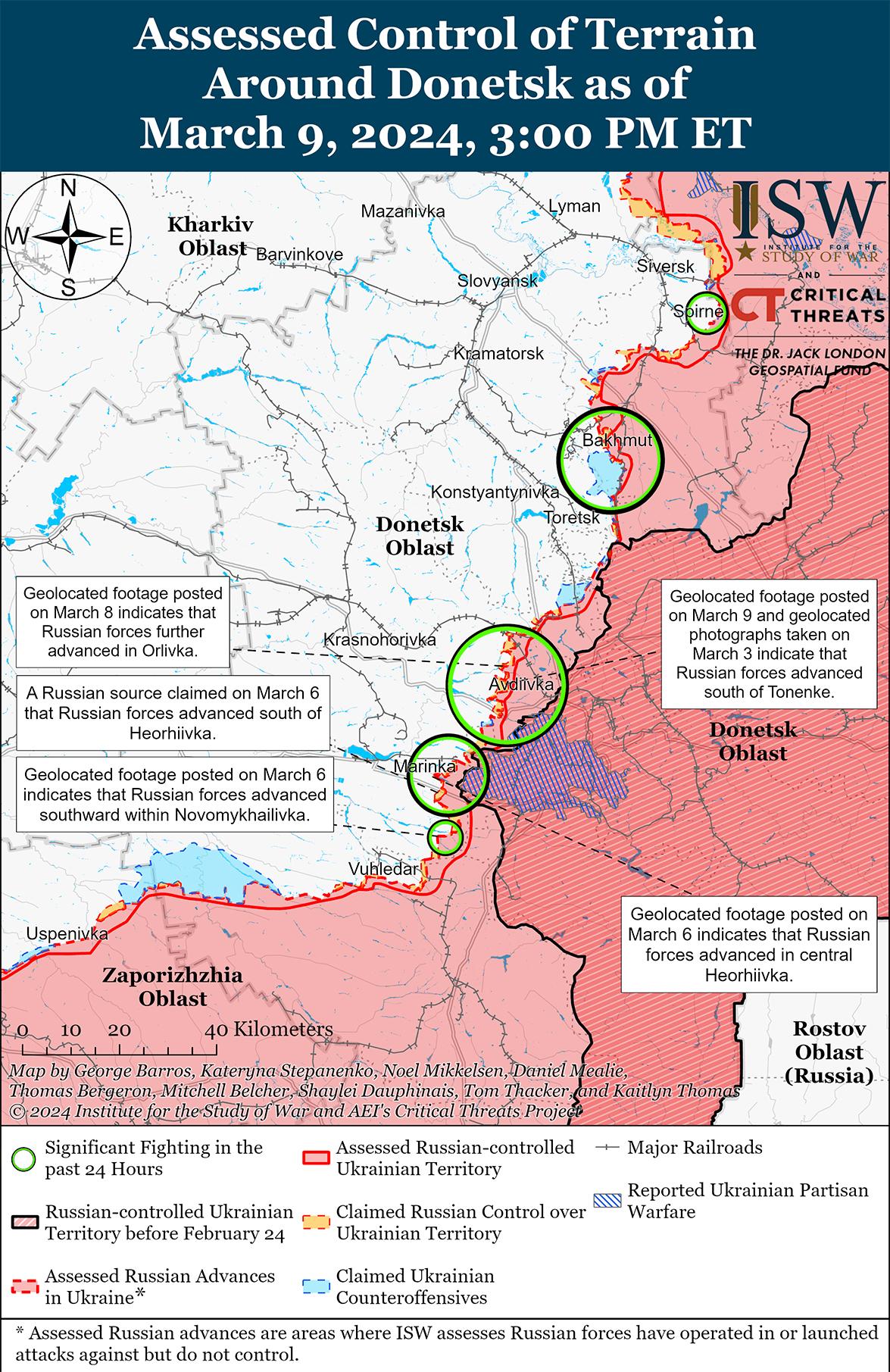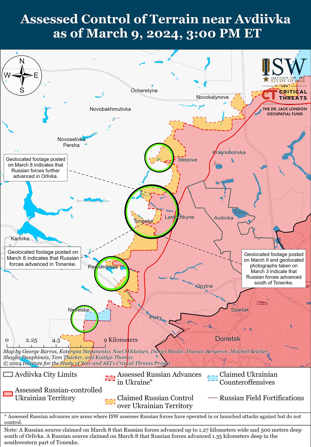 Спикер украинской Таврийской группировки войск Дмитрий Лиховой 8 марта заявил, что ситуация на Авдеевском направлении стабилизировалась и российские войска в настоящее время добиваются лишь точечных незначительных успехов. [27] Недавно российские войска продвинулись к западу от Авдеевки, а 9 марта бои в этом районе продолжались. На геолоцированных кадрах, опубликованных 8 марта, видно, что российские войска недавно продвинулись дальше в центре Орловки (к западу от Авдеевки). [28] На геолоцированных кадрах, опубликованных 9 марта, видно, что российские войска также незначительно продвинулись на полях к югу от Тоненького (к западу от Авдеевки), хотя российские войска, скорее всего, в последнее время этого не делали. [29] Российский военный блогер утверждал, что российские войска продвинулись на глубину до 500 метров на фронте шириной 1,27 км к югу от Орловки и до 1,35 км в глубину в районе юго-западного Тоненького. [30] Продолжались позиционные бои северо-западнее Авдеевки в районе Степного, Бердичей и Семеновки; западнее Авдеевки в районе Орловки, Тоненького и Северного; и юго-западнее Авдеевки в районе Первомайского и Невельского. [31] На Авдеевском направлении продолжают действовать подразделения российской 1-й мотострелковой бригады «Славянская» (1-й армейский корпус ДНР), а в районе Невельского, а в районе Невельского, по имеющимся данным, действуют подразделения 110-й мотострелковой бригады (1-й АК ДНР). [32]