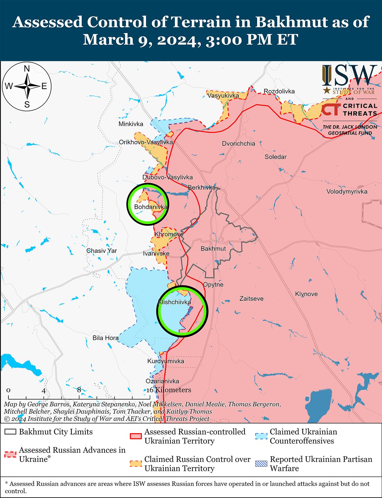 Позиционные бои под Бахмутом продолжались 9 марта, но подтвержденных изменений на линии фронта не было. Российский военный блогер заявил, что российские войска незначительно продвинулись в районе Ивановского (к западу от Бахмута) и что российские войска контролируют более половины населенного пункта, но ISW не обнаружил визуальных подтверждений этих заявлений. [24] Продолжались позиционные бои северо-западнее Бахмута в районе Богдановки; западнее Бахмута в районе Ивановского; юго-западнее Бахмута в районе Клещеевки и Андреевки; и южнее Бахмута в районе Дружбы и Шум. [25] По имеющимся сведениям, вблизи Богдановки действуют подразделения российской добровольческой бригады «Восток-В» (Российский добровольческий корпус). [26]