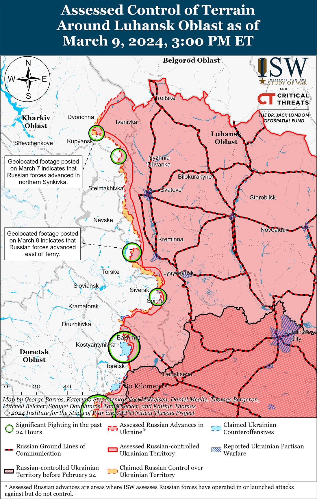 Недавно российские войска продвинулись к западу от Кременной на фоне продолжающихся позиционных боев вдоль линии Купянск-Сватово-Кременная 9 марта. Геолоцированные кадры, опубликованные 8 марта, свидетельствуют о том, что российские войска недавно продвинулись к востоку от Терны (к западу от Кременной). [21] Продолжались позиционные бои северо-восточнее Купянска в районе Синьковки и озера Лиман; юго-восточнее Купянска в районе Кисловки; западнее Кременной в районе Ямполовки и Терны; и к югу от Кременной возле Спорного. [22] По имеющимся сведениям, подразделения российских 123-й и 7-й мотострелковых бригад (2-й армейский корпус Луганской Народной Республики (ЛНР)) действуют в районе Белогоровка (12 км южнее Кременной). [23]