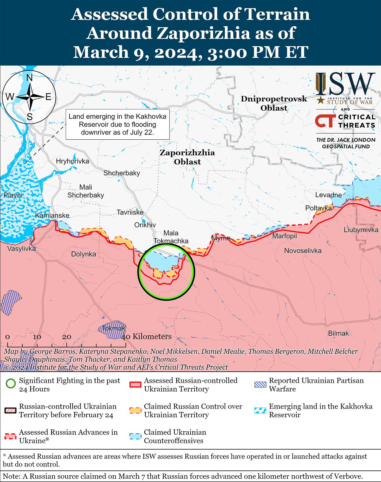 По состоянию на 9 марта на западе Запорожской области продолжались позиционные бои, однако подтвержденных изменений линии фронта на этом участке не было. Украинские и российские источники сообщили, что позиционные бои продолжались в районе населенных пунктов Работино и Вербовое (к востоку от Работино). [35] Российский военный блогер утверждал, что российские войска снизили темп своих наступательных операций в районе Работино из-за ударов украинских беспилотников и трудностей с разминированием захваченных украинских окопов. [36] Блогер утверждал, что российские войска также борются с недостаточной защитой средств радиоэлектронной борьбы (РЭБ) в районе Работино. [37] Сообщается, что на Запорожском направлении действуют подразделения российской 69-й бригады прикрытия и 165-й артиллерийской бригады (обе — 35-я общевойсковая армия, Восточный военный округ); сообщается, что подразделения 42-й мотострелковой дивизии (58-я ОА, Южный военный округ [ЮВО]) действуют в районе Работино; сообщается, что подразделения 247-го воздушно-десантного полка (7-й дивизии ВДВ) действуют в районе Работино и Вербовое. [38]