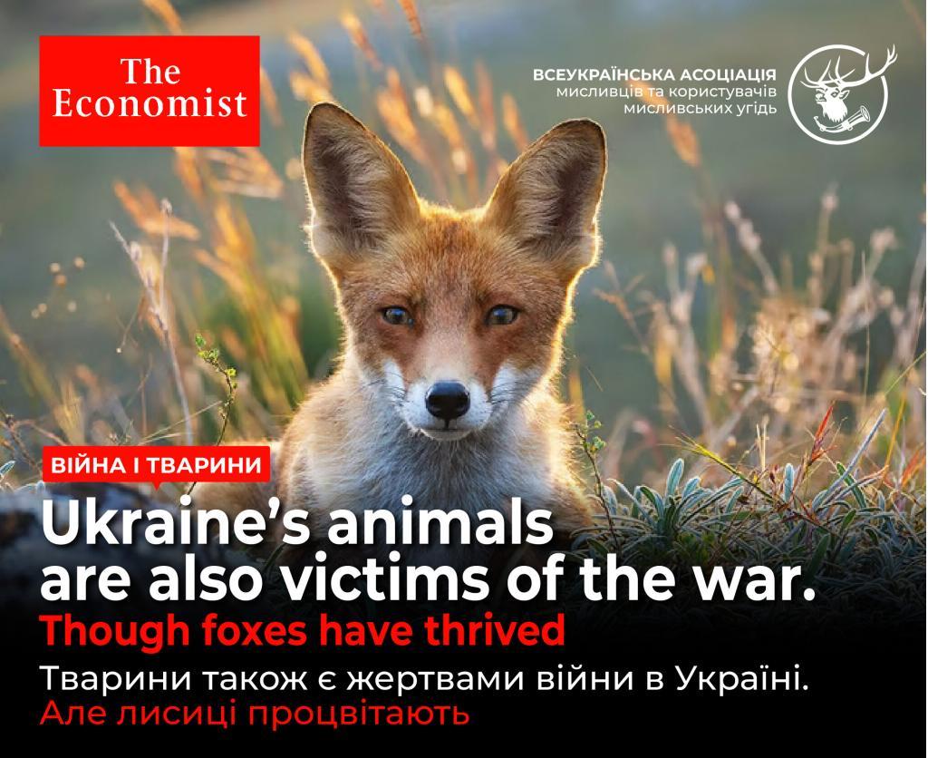 У публікації “Ukraine’s animals are also victims of the war. Though foxes have thrived” видання The Economist, зокрема йдеться, що війна в Україні, яка триває вже два роки, торкнулася тварин так само, як і людей, але не однаково. Бойові дії, напевно, спричинили загибель великої кількості тварин, зокрема чорноморських дельфінів. Проте заборона полювання в Україні на період воєнного часу пішла на користь хіба лисицям, чисельність яких різко зросла. Війна також завдала незліченної екологічної шкоди країні. Частина лісів та степів згоріли, а земля та вода, де йдуть бої – заражені вибуховими речовинами та хімікатами. На початку цього року український Уряд заявив, що війна вже завдала збитків довкіллю країни на суму близько 56 мільярдів доларів.