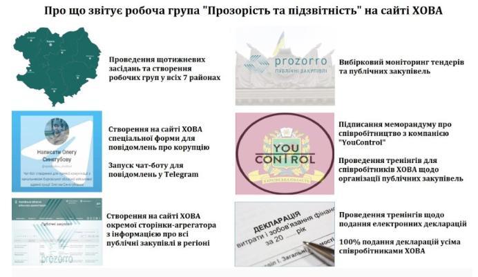 Аналіз діяльності робочої групи «Прозорість та підзвітність» (на матеріалах із сайту та YouTube-каналу ХОВА) дозволяє скласти системне уявлення, про що звітує робоча група, і що навпаки вона обходить своєю увагою. Основним предметом звітування є не результат роботи, а сам факт проведення якихось заходів – засідань, брифінгів, форуму, тренінгів тощо. При цьому ті ж тренінги для співробітників ХОВА мали б проводитись і без створення якихось робочих груп – це було передбачено документами, затвердженими ще до появи «Прозорості та підзвітності». Також робоча група звітує про вибірковий розгляд публічних закупівель – зазвичай, за тими напрямами, де немає великих сум, із неодмінним додаванням у пострелізи фрази «порушень не виявлено». А оминає увагою «Прозорість та підзвітність» оголошені самою ХОВА найбільш коштовні тендери відбудови та гучні корупційні скандали, пов’язані із самою обласною адміністрацію. На додачу, робоча група з контролю за використанням бюджетних коштів у своїх рішеннях посилається на обґрунтування від посадовців, що перебувають під слідством за розкрадання бюджетних коштів. Вочевидь, все це лише закріплює суспільне уявлення про наскрізь корумповану владу, попри її зусилля створити ілюзію боротьби з казнокрадством.