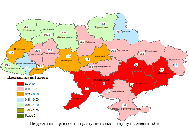Украина – крупная лесная держава. По объему заготовки древесины она занимает десятое, общей площади лесов – восьмое, растущему запасу стволовой древесины – шестое место в Европе (табл.1.,рис.1). Значительно хуже показатели относительной лесообеспеченности страны. По площади и запасу растущего леса в пересчете на одного жителя она находится, соответственно, на 27 и 21 месте. Показатели лесообеспечнности в границах областей Украины различаются на два порядка (рис.2). Если в Запорожской области на одного жителя приходится менее 3 кбм растущего запаса (меньше, чем в Туркменистане, но больше, чем в Израиле), то в Закарпатской, – 160 кбм (меньше, чем в Скандинавских странах, Латвии и Эстонии, но больше, чем в Словении, Австрии и Литве).