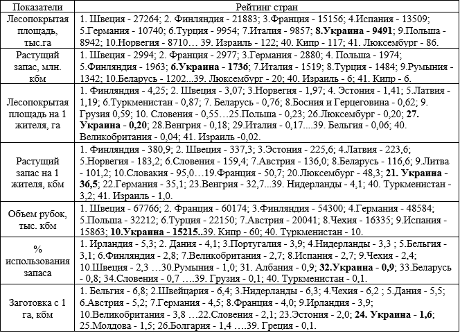 Табл.1. Место Украины в ряду европейских государств по показателям лесообеспеченности и интенсивности лесопользования