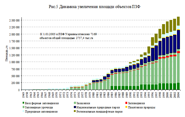 Площадь объектов ПЗФ в Украине стремительно растет (рис.5). К настоящему времени, к ним отнесено 13.7% общей площади лесов. Однако, многие специалисты, представляющие интересы государства, считают, что площадь охраняемых территорий в стране недостаточна. Их мнение положено в основу проекта концепции программы развития природно-заповедного дела в Украине, поданного правительству для рассмотрения и принятия. В этом документе указывается, что в большинстве стран Европы доля заповедных территорий достигает 10-25% общей территории, тогда как в Украине, по состоянию на 1.01.2005 г она равнялась 4.57%.