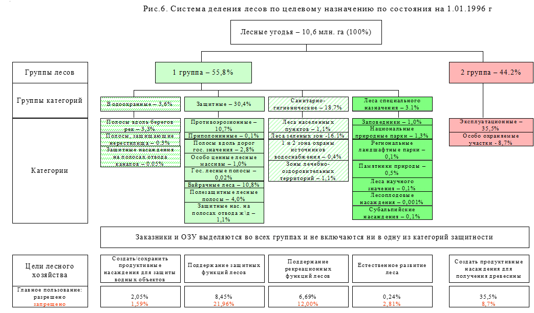 Основная причина различий кроется в стратегии охраны и использования лесов. Украина унаследовала советскую модель «неистощительного лесопользования», которая коренным образом отличается от европейской модели «устойчивого лесоуправления». Суть различий проста: признавая многоцелевое значение лесов, советские ученые разделили их на три группы и многочисленные категории защитности, в которые вошли лесные массивы и участки, однородные по основной своей функции. Территория СССР позволяла «назначить» каждому участку леса одно основное назначение. Кроме того, была создана система объектов природно-заповедного фонда, которая охватывала все типы ландшафтов, в том числе и леса. Анализ системы деления лесов Украины по целевому назначению, построенной на основе данных последнего (1996 г.) полноценного учета лесного фонда страны (рис.6), позволил выявить следующие недостатки используемой классификации: