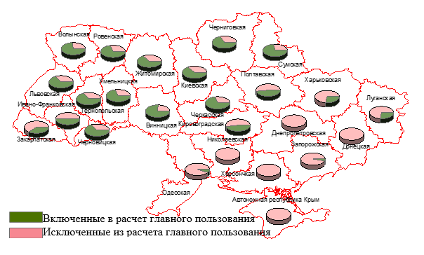 Доля лесов Госкомлесхоза, исключенных из расчета главного пользования, сильно варьирует по областям Украины (рис.7). В степных областях (кроме Кировоградской) и АР Крым из эксплуатации выведены практически все леса (94-100%). Половина и более лесов исключено из эксплуатации в Ивано-Франковской (49.5%), Полтавской (52.1%), Кировоградской (52.5%), Закарпатской (61.2%), Харьковской (72.2%) и Луганской (72.4%) областях. Минимальная доля исключенных из эксплуатации лесов в Винницкой (24.4%), Волынской (26.6%), Сумской (27.5%), Черкасской (30.4%) и Хмельницкой (31%) областях. Следует учитывать, что по стране в целом доля исключенных лесов будет заметно выше, за счет учета лесов национальных парков, заповедников, лесопарковых хозяйств, зоны отчуждения, находящихся вне управления Госкомлесхоза.