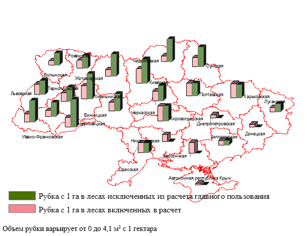 Официальная статистика подтверждает то, что средняя интенсивность использования лесных ресурсов в Украине не значительна, но это не является свидетельством отсутствия в стране «варварских» лесозаготовок. Ежегодно лесная охрана предприятий Госкомлесхоза выявляет и фиксирует в отчетности около 30 тыс.кбм нелегально заготовленной древесины, половина из которой приходится на Закарпатскую область. К сожалению, никто не в состоянии достаточно аргументировано ответить на вопрос о том, «какой процент нелегально заготовленной древесины выявляется и фиксируется?». По нашим оптимистичным оценкам, в протоколы попадает не более 2-5% реального объема украденной древесины. В основном нелегальные рубки производятся в лесах бывших агроформирований. Степень расстроенности этих лесов не может быть следствием легальных заготовок, интенсивность которых значительно ниже, чем в лесах Госкомлесхоза ( в 2004 году на одном гектаре лесов Госкомлесхоза заготовлено – 2.04 , а Минагрополитики только 0.44 кбм древесины).