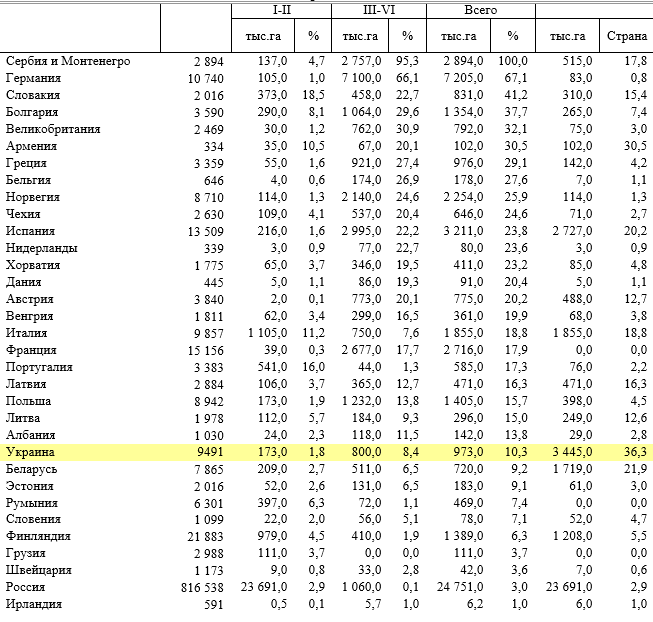 Площадь охраняемых территорий, приведенная в таблице 3, соотносится с общей площадью страны. И здесь Украина занимает одно из последних мест. Для того чтобы понять причины этого следует обратить внимание на данные по России, которая в этом рейтинге находится значительно выше Украины, имея 7.5% охраняемых территорий. Подобный рывок произошел за счет изменения площади охраняемых объектов III –VI категорий IUCN. При переходе от охраняемых лесов (табл.2) ко всем охраняемым объектам их площадь выросла в 100 раз, – с 1 до 104 млн.га. Для Украины данные таблиц 2 и 3, практически идентичны: 800 тыс.га охраняемых лесов (2000 г.) и 1138 тыс.га охраняемых объектов III –VI категорий IUCN (2003 г.). В категорию VI украинские специалисты отнесли только 1800 га охраняемых территорий.