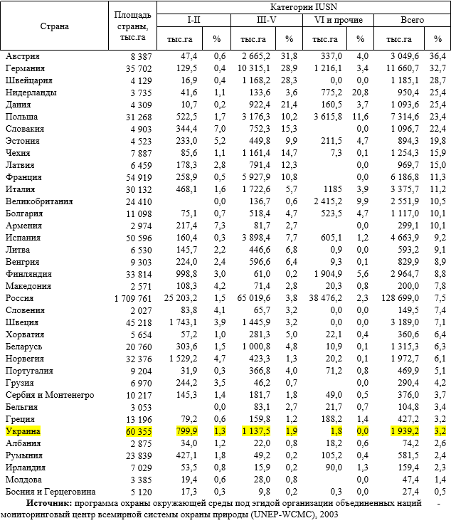 В таблице 2 приведено распределение лесов охраняемых природных территорий стран Европы по категориям IUCN (данные ФАО по состоянию на 2000 год). В таблице 3 содержатся аналогичные данные, но для всех без исключения охраняемых территорий по состоянию на 2003 год. Прежде чем приступить к их анализу подчеркнем то, что официальная международная статистика формируется на основе отчетов национальных корреспондентов, которые несут полную ответственность за ее достоверность. Таким образом, за истинность данных по Украине, представленных в таблице 2 отвечают конкретные специалисты Госкомлесхоза, а за данные таблицы 3 Министерства охраны окружающей среды.