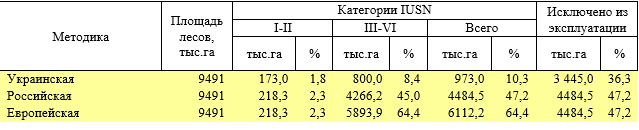 Табл.4. Распределение лесов охраняемых природных территорий Украины по категориям IUSN, полученное по разным методикам