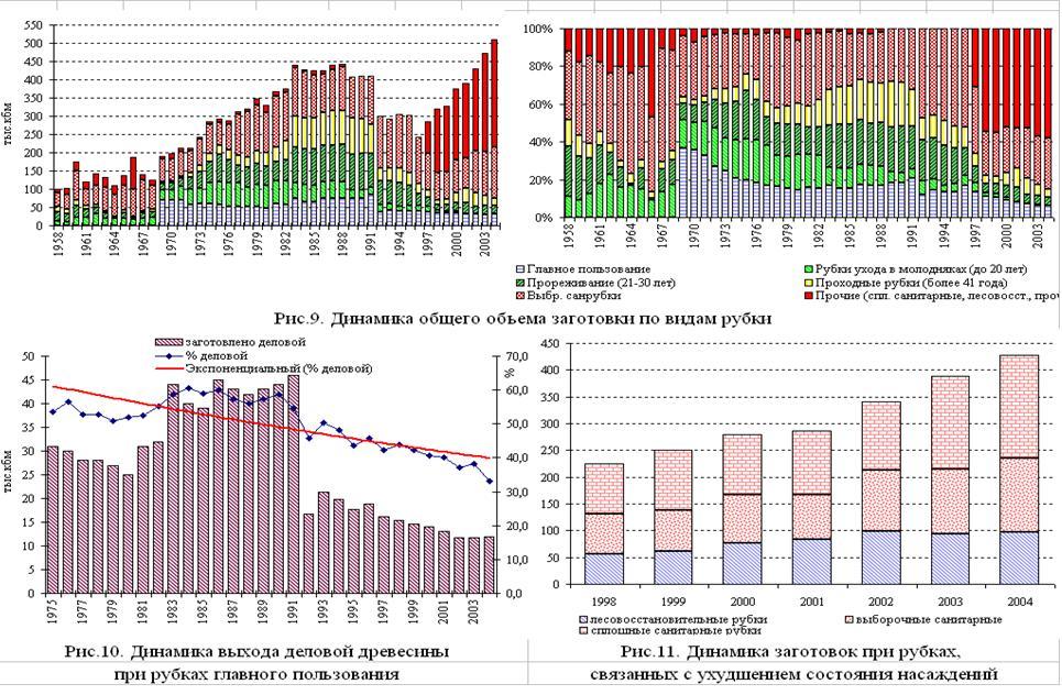 - по экспоненте возрастает объем заготовок в ходе рубок связанных с ухудшением состояния и распадом древостоев. В 2004 году, в ходе санитарных и лесовосстановительных рубок заготовлено более 400 тыс.кбм, что соответствует общему объему заготовки древесины в области в начале 90-х годов;