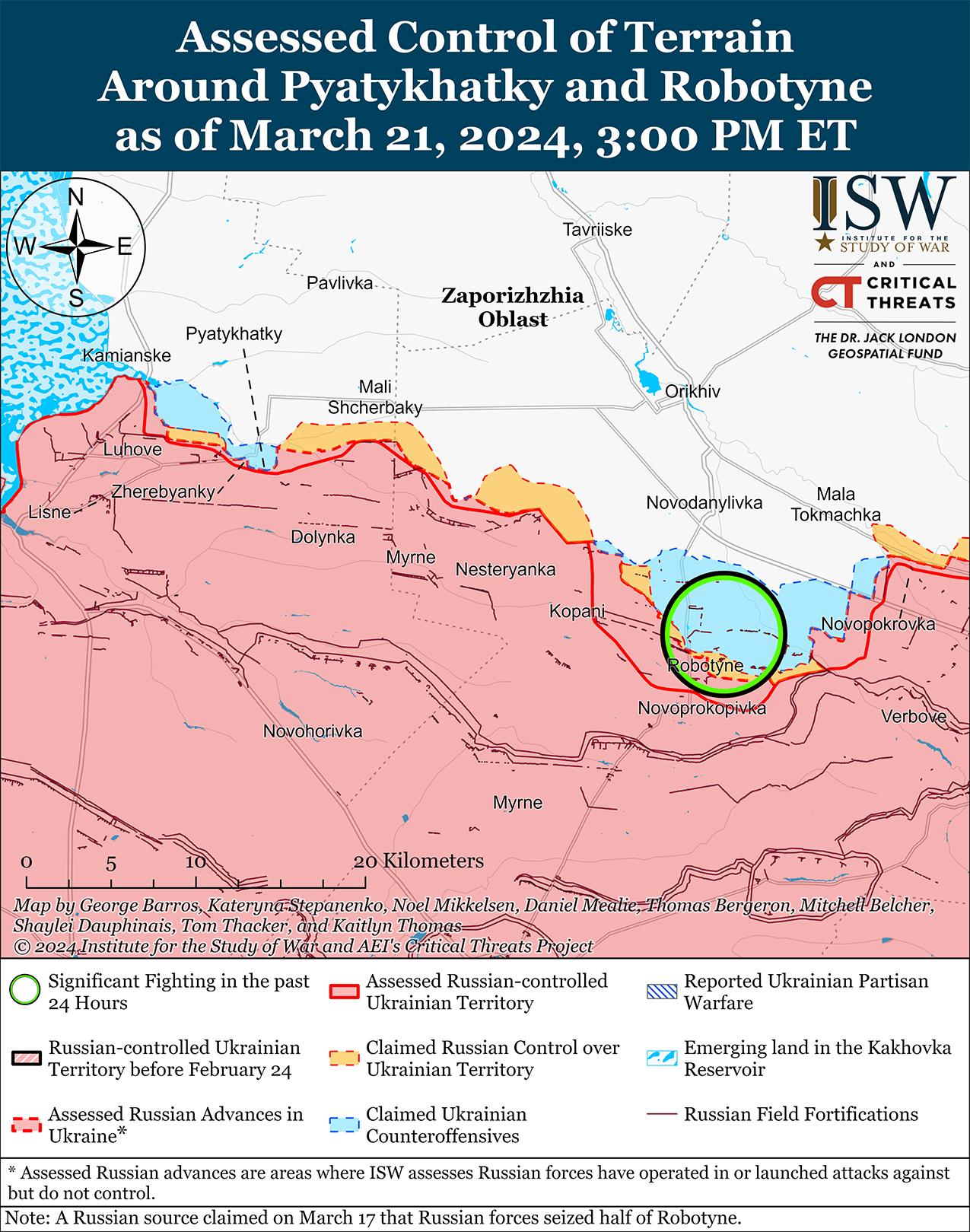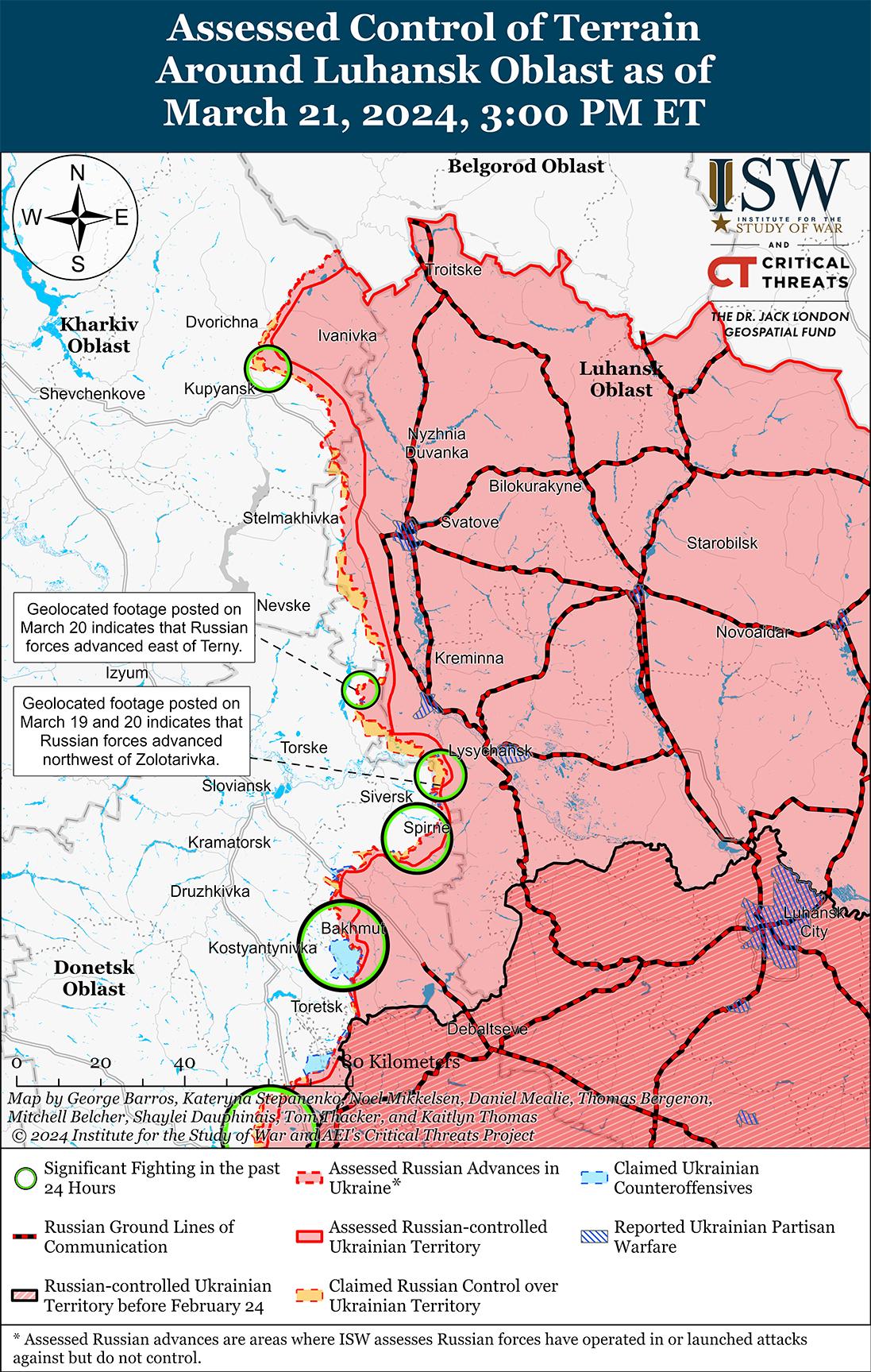 - 20 марта агентство Bloomberg сообщило, что неназванный источник, близкий к Кремлю, заявил, что общероссийские проукраинские вторжения в Белгородскую область вынуждают российских военных отвлекать силы от линии фронта в Белгородскую область, хотя ISW не наблюдал таких заявлений.