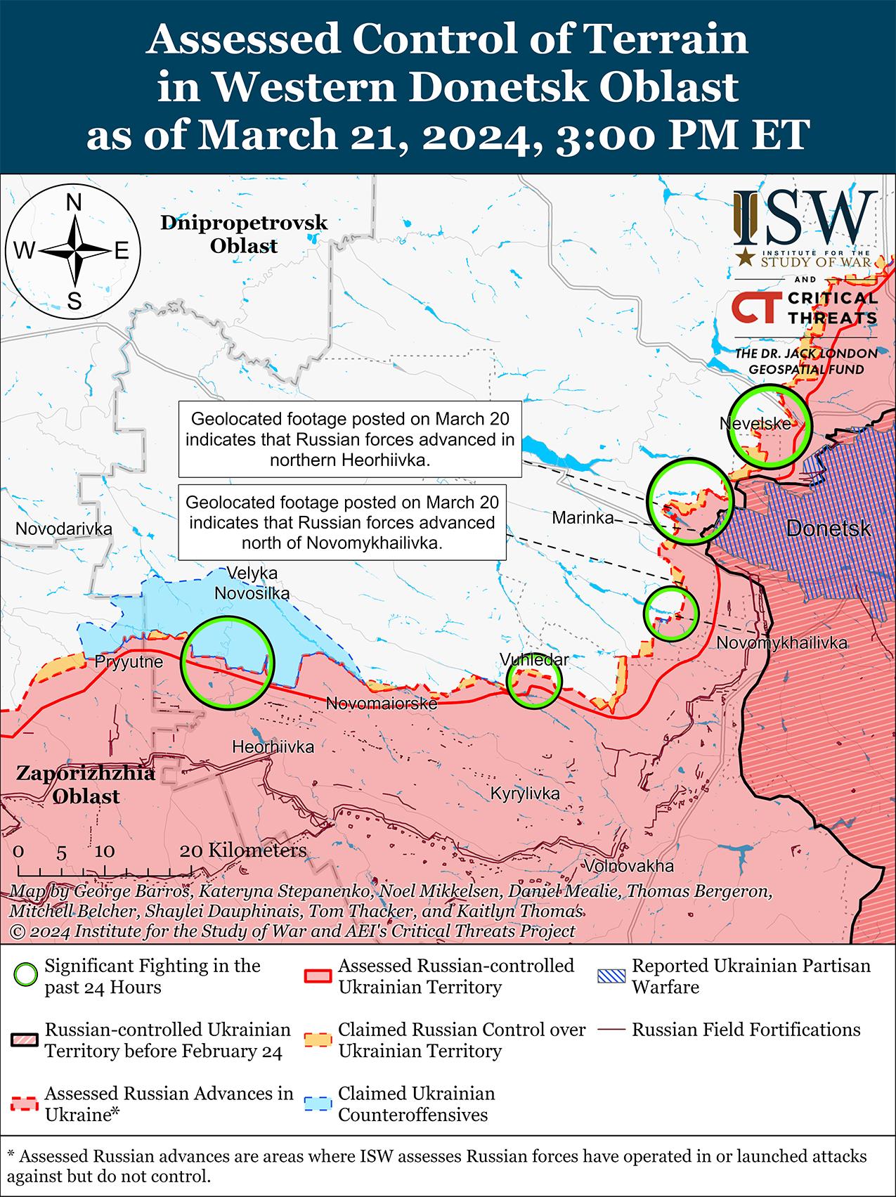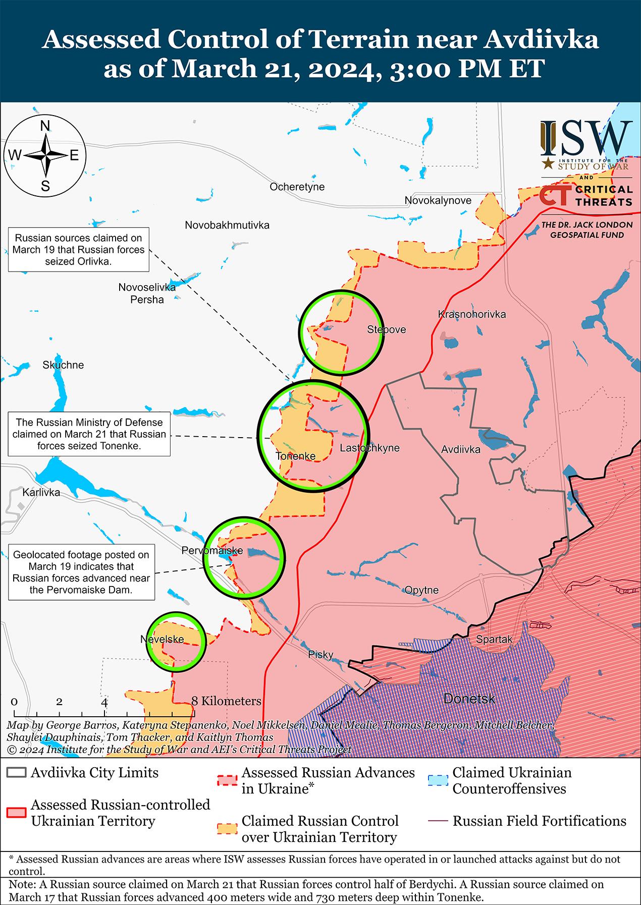 Минобороны РФ заявило, что 21 марта российские войска захватили Тоненькое (западнее Авдеевки) на фоне продолжающихся позиционных боев к западу от Авдеевки. [54] Российские военные блогеры в основном не подтверждали заявления Минобороны, утверждая, что российские войска продвинулись в районе Тоненького или в районе него, используя успехи в районе Орловки (к западу от Авдеевки) 21 марта. [55] Российский военный блогер утверждал, что российские войска контролируют половину Бердичей (северо-западнее Авдеевки). [56] Однако ISW не обнаружил подтверждения этим российским заявлениям. Продолжались позиционные бои северо-западнее Авдеевки в районе Бердичей; западнее Авдеевки в районе Семеновки и Тоненького; и юго-западнее Авдеевки вблизи Первомайского, Нетайлова и Невельского. [57] Сообщается, что в районе Бердичей действуют подразделения российской 74-й мотострелковой бригады (41-я общевойсковая армия, Центральный военный округ) и 1453-го мотострелкового полка (1-й АК ДНР). [58]