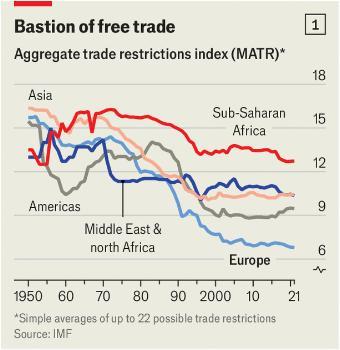 Итак, по мере того, как экономика континента оправляется от шока, вызванного Россией в 2022 году, не ясно как она будет адаптироваться к новому шоку со стороны Китая и, возможно, из Америки? Первый шок из Китая пришел в 2001 году, когда страна вступила в ВТО и воспользовалась более низкими торговыми барьерами, что стало проблемой для западных производителей. В Америке некоторые регионы и отрасли сильно пострадали. Европа отделалась более легким исходом, отчасти потому, что шок совпал со вступлением стран Центральной и Восточной Европы в ЕС. Быстрое развитие новых членов ЕС способствовало росту производительности труда в блоке и создало спрос на западные товары.