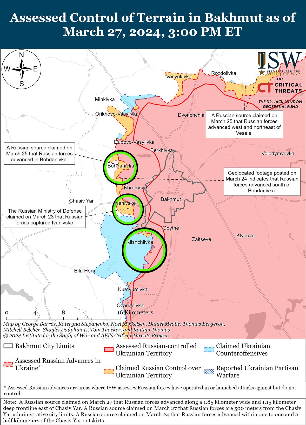 Сообщается, что российские войска продвинулись к западу от Бахмута, хотя 27 марта подтвержденных изменений линии фронта в этом районе не было. Российские военные блогеры утверждали, что российские войска продвинулись к западу от Бахмута вдоль железнодорожной ветки и участка трассы О0506 (Хромово-Часов Яр) на 1,15 километра в глубину и 1,85 километра в ширину. [25] Российский блогер утверждал, что подразделения 98-й воздушно-десантной дивизии (ВДВ) продвигаются в районе Ивановского и находятся в 500 метрах от городской черты Часового Яра (к западу от Бахмута). [26] Министр обороны России Сергей Шойгу приписал захват Ивановского 24 марта подразделениям российского 102-го мотострелкового полка (150-я мотострелковая дивизия, 8-я общевойсковая армия, Южный военный округ). [27] Продолжались позиционные бои северо-восточнее Бахмута в районе Веселого; северо-западнее Бахмута в районе Богдановки; западнее Бахмута в районе Ивановского; юго-западнее Бахмута в районе Клещеевки и Андреевки; и южнее Бахмута в районе Шумов и Южного. [28] Украинский военный обозреватель сообщил, что российские войска активизировали переброску техники и личного состава вдоль наземных коммуникаций через Кадиевку, Первомайск и Попасную (все к востоку от Бахмута), но не уточнил, куда они направляются. [29] Однако Кадиевка, Первомайск и Попасная расположены вдоль трассы Т0504 Луганск-Бахмут, которая идет прямо из российского тыла в оккупированной Луганской области в Бахмут.
