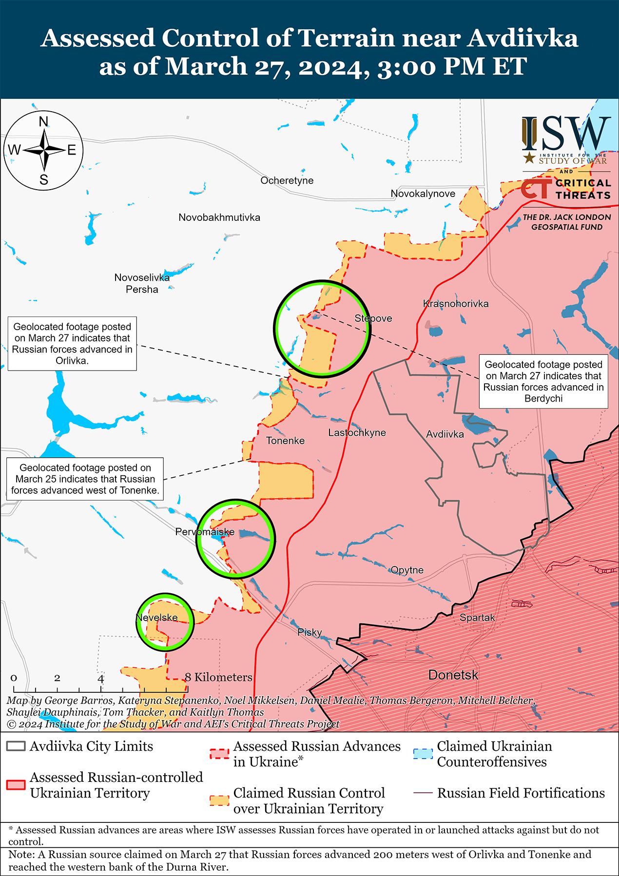 27 марта российские войска продвинулись к западу от Авдеевки на фоне продолжающихся позиционных боев в этом районе. Геолоцированные кадры, опубликованные 27 марта, показывают, что российские войска недавно продвинулись в Бердичи (к северо-западу от Авдеевки) и в Орловке (к западу от Авдеевки). [30] Российские военные блогеры утверждали, что российские войска вошли в Семеновку (северо-западнее Авдеевки) и атакуют украинские позиции в населенном пункте, однако украинские войска активно контратакуют в этом районе. [31] Российский блогер утверждал, что российские войска продвинулись на 200 метров к западу от Орловки на западном берегу реки Дурна, в 200 метрах к западу от Тоненького (к западу от Авдеевки), в 200 метрах в направлении Уманского (к западу от Авдеевки), в 300 метрах к югу от Тоненького в направлении Первомайского (юго-запад от Авдеевки) и в 100 метрах к югу от Невельского (к юго-западу от Авдеевки). [32] ISW не обнаружил визуального подтверждения этих утверждений. Продолжались позиционные бои северо-западнее Авдеевки в районе Бердичей и Семеновки; западнее Авдеевки вблизи Орловки, Тоненького и Уманского; и юго-западнее Авдеевки вблизи Водяного, Невельского и Первомайского. [33]