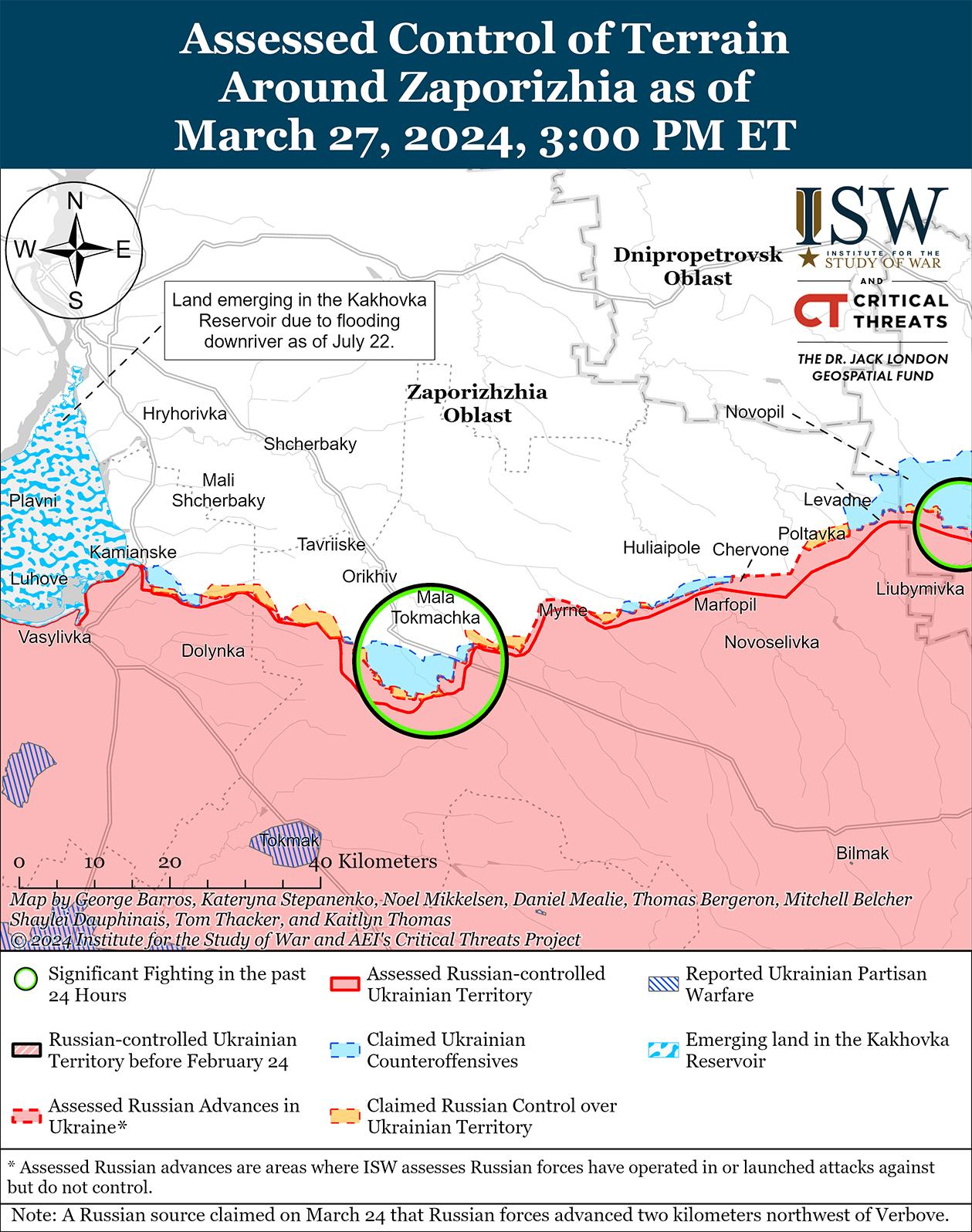 27 марта на западе Запорожской области продолжались позиционные бои, однако подтвержденных изменений на линии фронта не было. Продолжались позиционные бои в районе Работино, Малой Токмачки (северо-восточнее Работино), северо-восточнее Новопрокоповки (южнее Работино) и северо-западнее Вербовое (восточнее Работино). [38] Сообщается, что подразделения российского 71-го мотострелкового полка (42-я мотострелковая дивизия, 58-я общевойсковая армия, Южный военный округ [ЮВО]) продолжают действовать в Работино. [39]