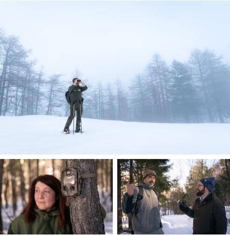 Сверху против часовой стрелки: рейнджеры обыскивают парк Гран-Боско-ди-Сальбертран в поисках следов волков; фотоловушки используются, чтобы узнать больше об их поведении; Лука Ансельмо (слева), исследователь волков и следопыт.