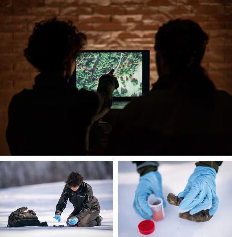 Вверху: анализ данных с ошейников, для отслеживания перемещения волков дают представление об их поведении. Внизу: сбор волчьего помета для анализа.