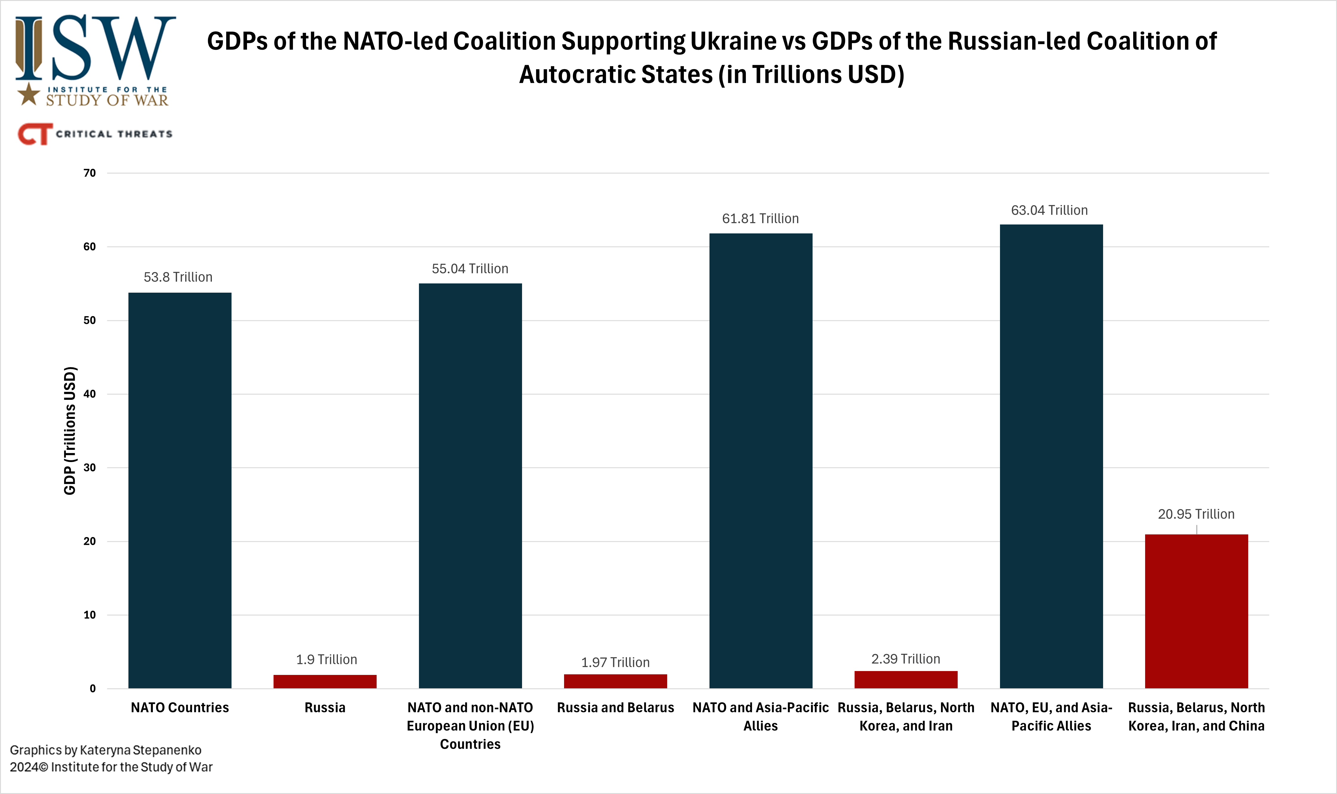 Россия не может победить ни Украину, ни Запад – и, скорее всего, проиграет – если Запад мобилизует свои ресурсы для сопротивления Кремлю. Существующие и скрытые возможности Запада затмевают возможности России. Совокупный валовой внутренний продукт (ВВП) стран НАТО, государств Европейского союза, не входящих в НАТО, и наших азиатских союзников составляет более 63 триллионов долларов. [1] ВВП России близок к 1,9 триллиона долларов. [2] Иран и Северная Корея мало что добавляют в плане материальной поддержки. Китай помогает России, но он не мобилизован от имени России и вряд ли это сделает. [3] Если мы надавим и увеличимся, Россия проиграет.