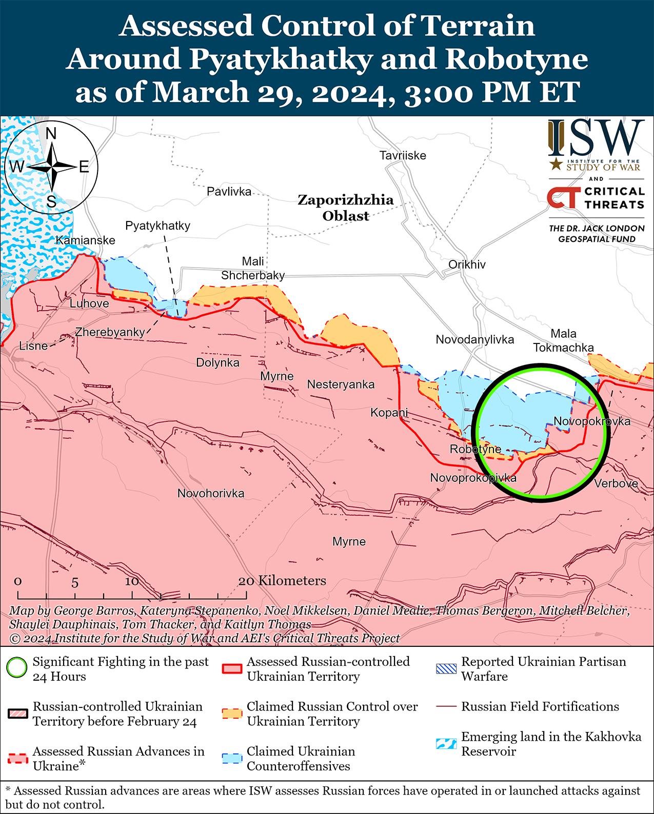 Недавно появившаяся практика нанесения ударов по украинским плотинам и гидроэлектростанциям со стороны России является важным поворотным моментом и эскалацией российской ударной кампании против Украины. Российские силы ранее не наносили устойчивых ракетных ударов по украинским плотинам и гидроэлектростанциям. США и европейские страны по-прежнему не желают предоставлять Украине материальные средства, которые могут оказаться оперативными или стратегически значимыми и способствовать значительным наступательным усилиям Украины, из-за опасений эскалации ситуации со стороны России или возмездия. Однако решения западных государств ограничить обороноспособность Украины в попытке справиться с эскалацией не смогли помешать России эскалировать войну против Украины. Более того, Украина проводит стратегическую оборону, а не наступательные усилия, которые могут серьезно угрожать российским позициям на оккупированной Украине или российской территории. Председатель Объединенного комитета начальников штабов США генерал Чарльз Браун-младший заявил 28 марта по поводу поставок Украине ракет ATACMS большой дальности, что «риск эскалации не так высок, как, возможно, был в начале [российской войны]» полномасштабного вторжения в Украину].»[30] Россия последовательно доказывала свою готовность эскалировать свою агрессию без провокаций, и опасения по поводу возмездия и эскалации со стороны России в ответ на дальнейшее предоставление Украине западного оружия и систем не должны диктовать США или другим странам принятие решений Запада относительно этой помощи.[31]