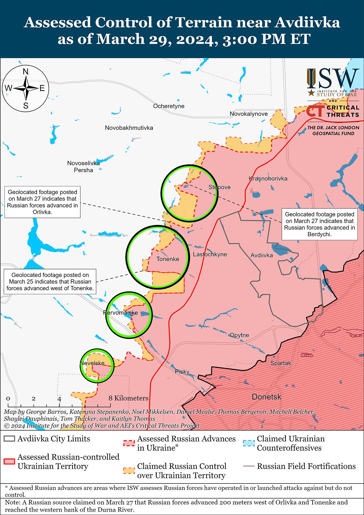 Недавно российские войска подтвердили продвижение к северо-западу и западу от Авдеевки на фоне продолжающихся позиционных боев в этом районе 29 марта. Геолоцированные кадры, опубликованные 28 марта, свидетельствуют о том, что российские войска недавно незначительно продвинулись к северу от Красногоровки (северо-западнее Авдеевки). [53] На дополнительных геолоцированных кадрах, опубликованных 19 марта, видно, что российские войска незначительно продвинулись южнее Невельского (юго-западнее Авдеевки). [54] Российские военные блогеры утверждали, что российские войска постепенно продвигаются к северо-западу и западу от Тоненького (к западу от Авдеевки). [55] Продолжались позиционные бои северо-западнее Авдеевки в районе Семеновки и Бердичей; западнее Авдеевки в районе Тоненького и Уманского; и юго-западнее Авдеевки в районе Первомайского и Невельского. [56]