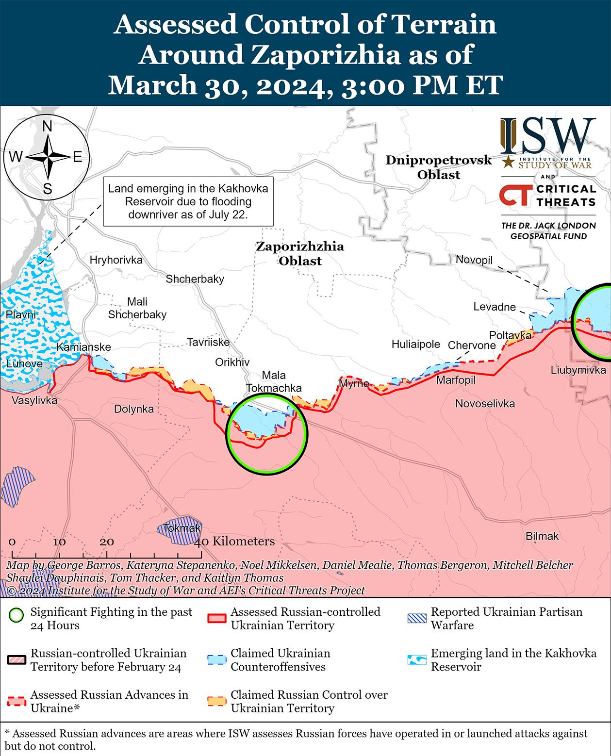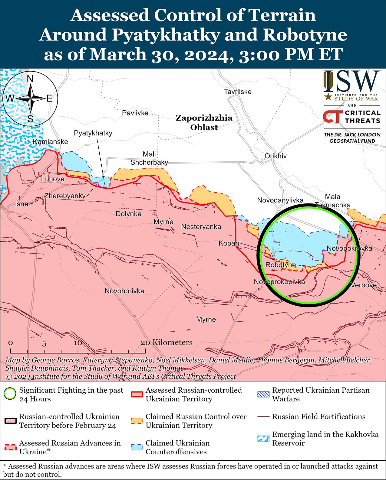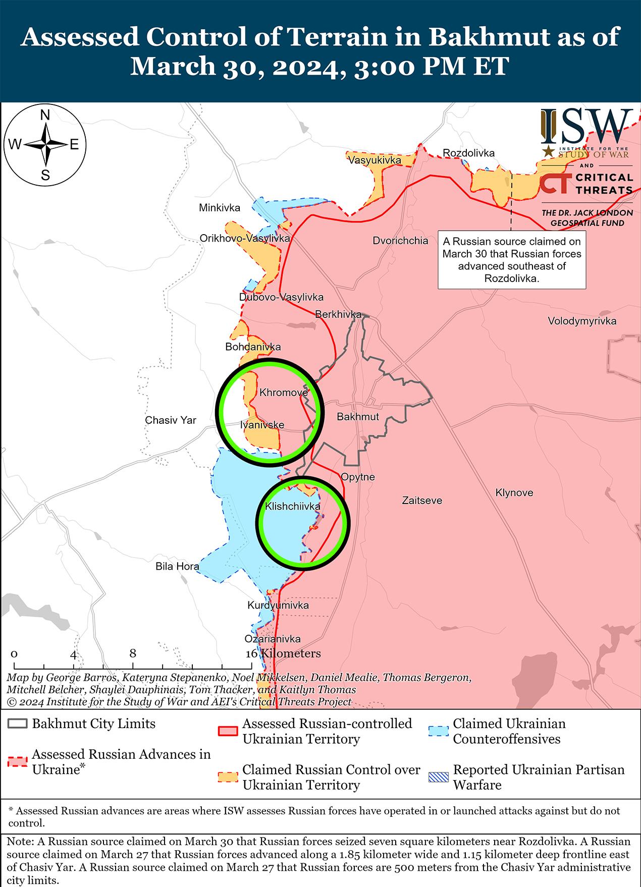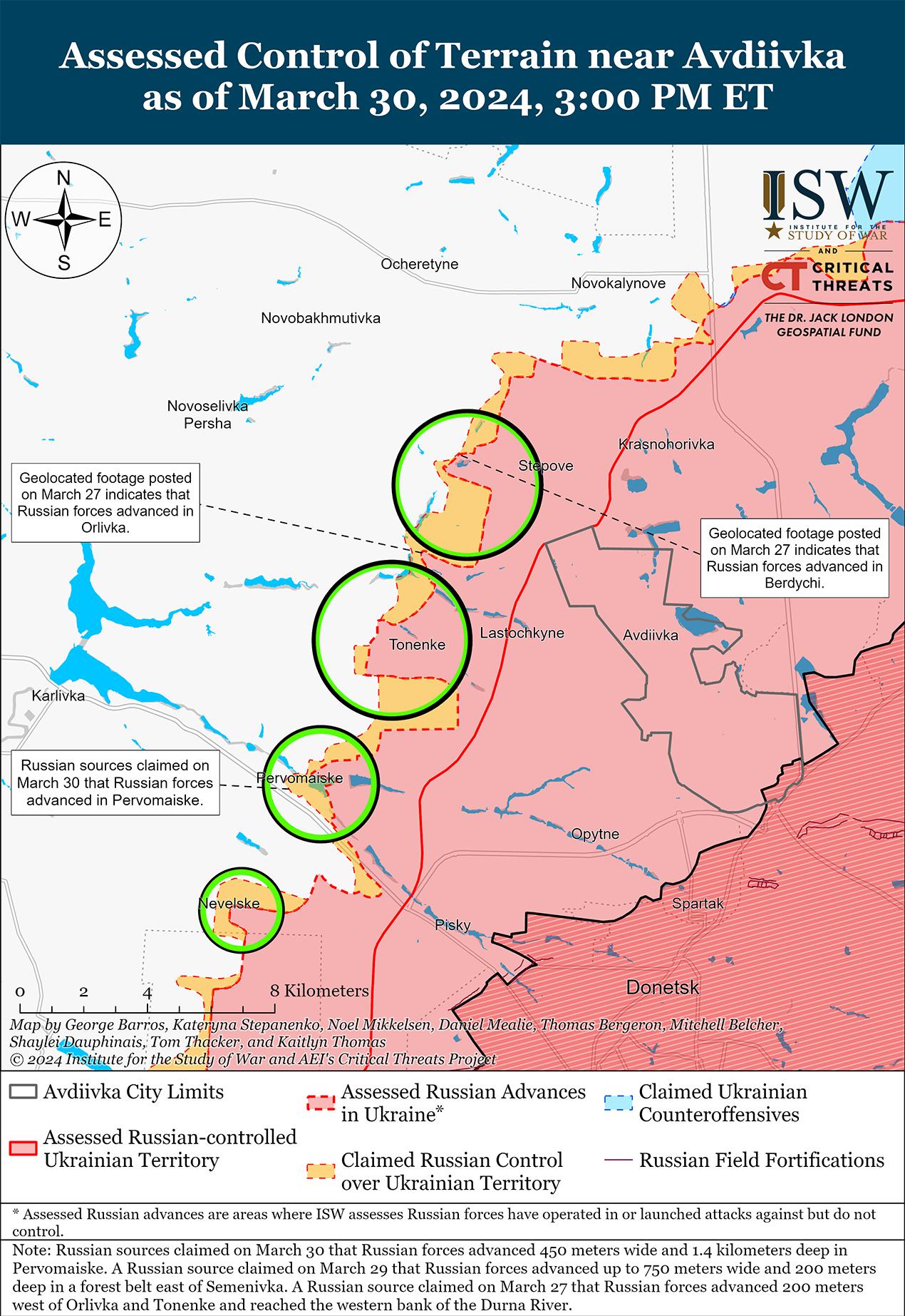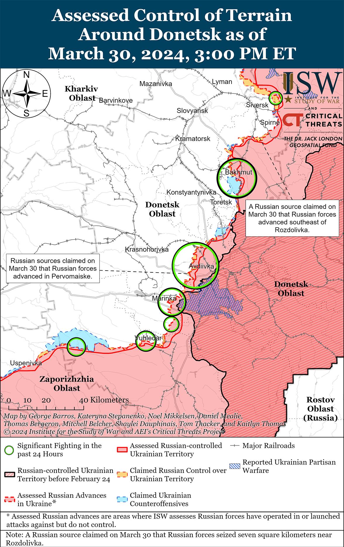Российские источники утверждали, что российские войска продвинулись к северо-западу и юго-западу от Авдеевки 29 и 30 марта. Российский военный блогер утверждал, что российские подразделения Южной группировки войск и 1-го АК вошли в восточную окраину Семеновки (северо-западнее Авдеевки) и продвинулись в этом районе на фронте до 750 метров и глубину до 200 метров. [39] Военный блогер добавил, что российские войска продвинулись на 450 метров по фронту и 1,4 км в глубину в районе Первомайского (юго-западнее Авдеевки). [40] Российские источники также утверждали, что российские войска заняли новые позиции в Бердичах (северо-западнее Авдеевки). [41] ISW не может независимо проверить эти заявления. Продолжались позиционные бои северо-западнее Авдеевки в районе Бердичей и Семеновки; западнее Авдеевки вблизи Уманского, Орловки, Тоненького и Нетайлова; и юго-западнее Авдеевки в районе Первомайского и Невельского. [42] Сообщается, что подразделения 114-й мотострелковой бригады и разведывательного батальона «Спарта» (оба входят в состав 1-го АК) действуют в районе Авдеевки, а подразделения 9-й мотострелковой бригады (1-го АК) – в районе Первомайского. [43]