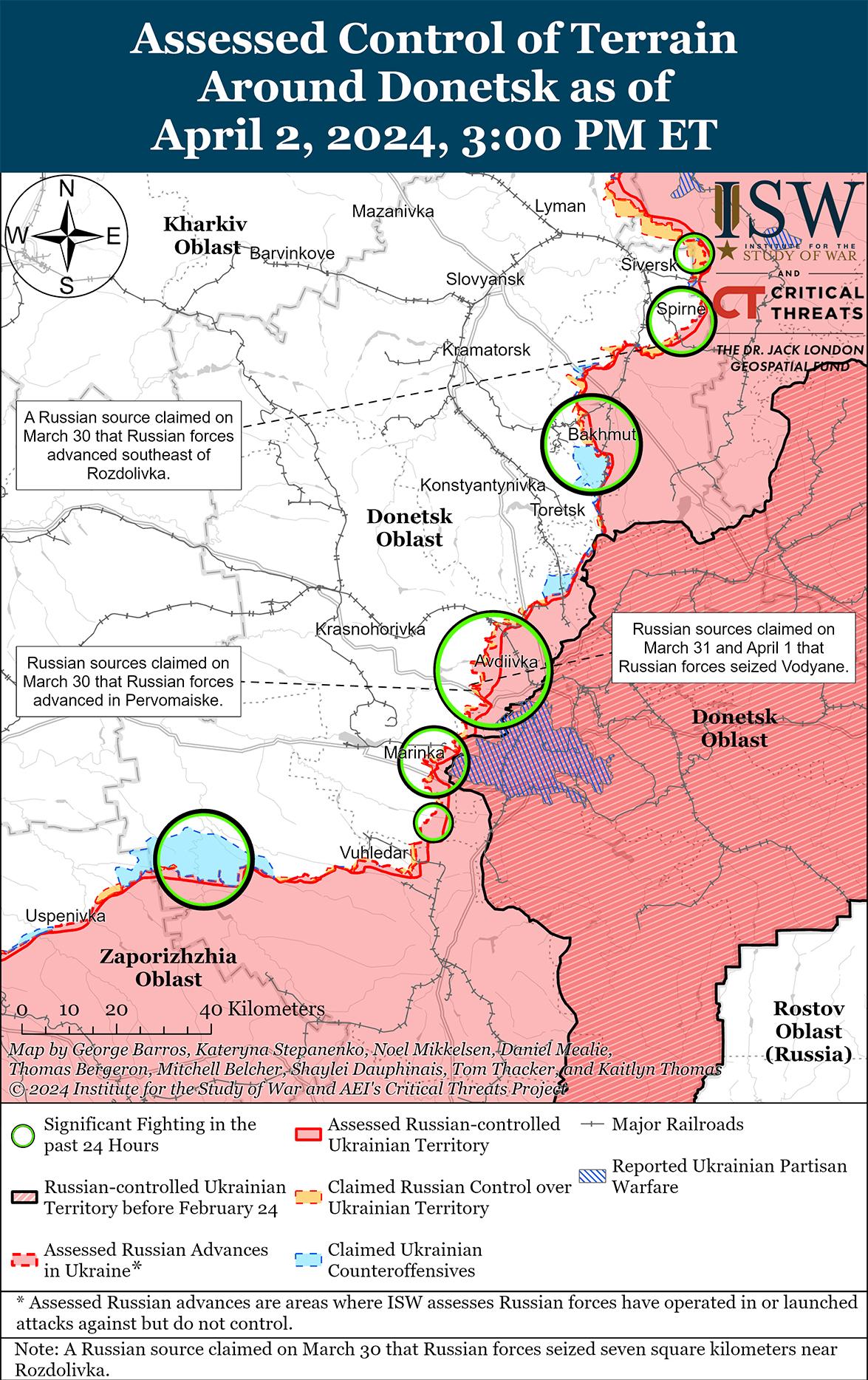 Министр обороны России Сергей Шойгу заявил 2 апреля, что российские войска захватили около 400 квадратных километров украинской территории за первые три месяца 2024 года — темпы продвижения не обязательно отражают более широкие наступательные перспективы России из-за задержек американской помощи в области безопасности. Шойгу заявил во время селекторного совещания с российским военным руководством 2 апреля, что с начала 2024 года российские войска захватили 403 квадратных километра территории в Украине. [4] ISW обнаружил только визуальные доказательства, позволяющие ISW подтвердить, что российские войска захватили около 305 квадратных километров в период с 1 января по 1 апреля 2024 года. ISW продолжает оценивать, что нехватка материалов вынуждает Украину экономить боеприпасы и отдавать приоритет ограниченным ресурсам критически важным участкам фронта, однако увеличивает риск прорыва России на других, менее обеспеченных участках и делает линию фронта в целом более хрупкой, чем нынешние относительно медленные темпы продвижения российских войск. [5] Ограничения Украины в материальной части также обеспечивают российским войскам гибкость в проведении наступательных операций, что может привести к сложным и нелинейным возможностям для российских войск добиться оперативно значимых успехов в будущем. [6]